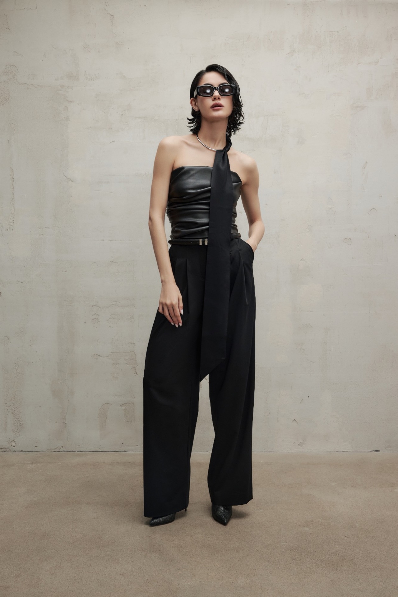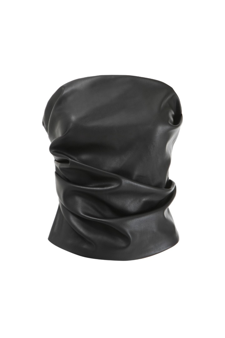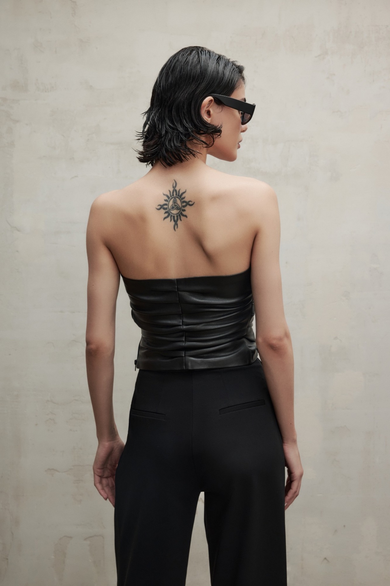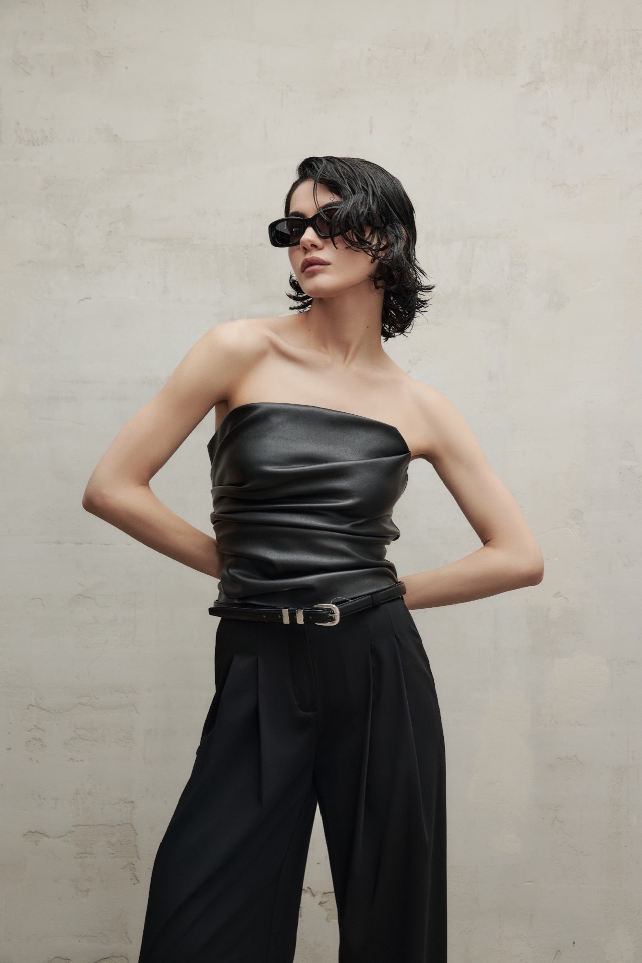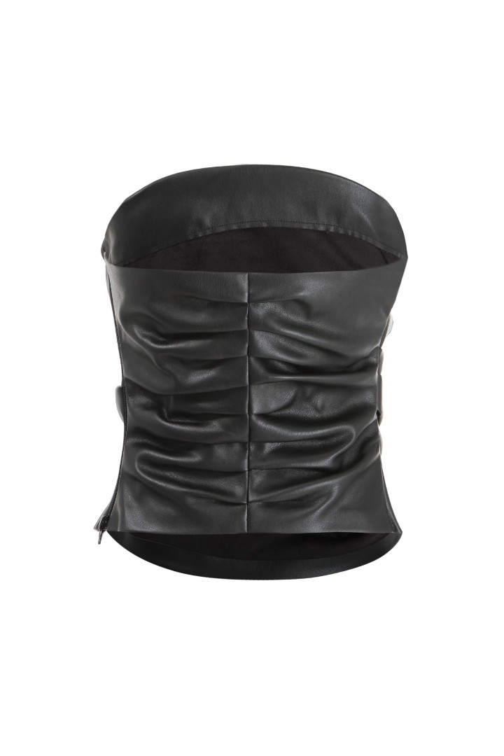 Асимметричный топ из эко-кожи без бретелей. Модель фигурного кроя станет основой и эффектных вечерних образов, и casual аутфитов в сочетании с расслабленными джинсами.