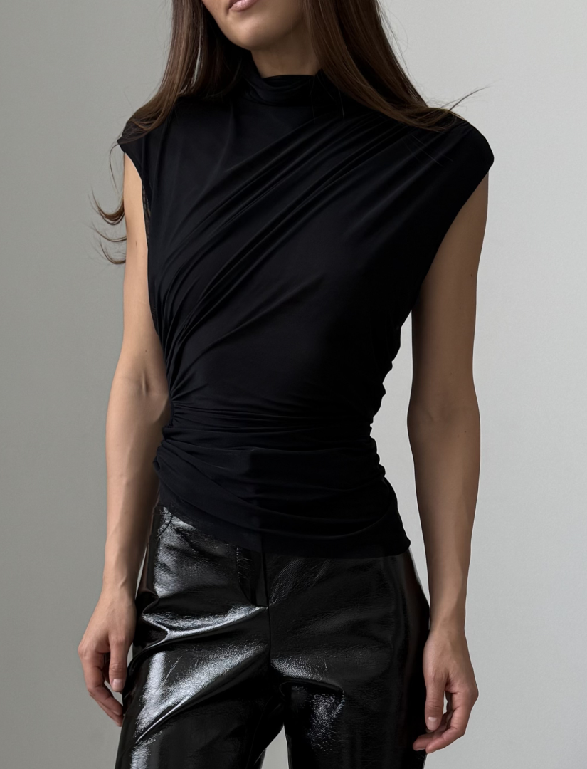 Топ облегающего кроя из тонкой сетки с асимметричной драпировкой, подчеркивающей силуэт. Воротник-стойка и короткий втачной рукав.