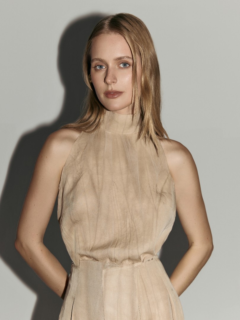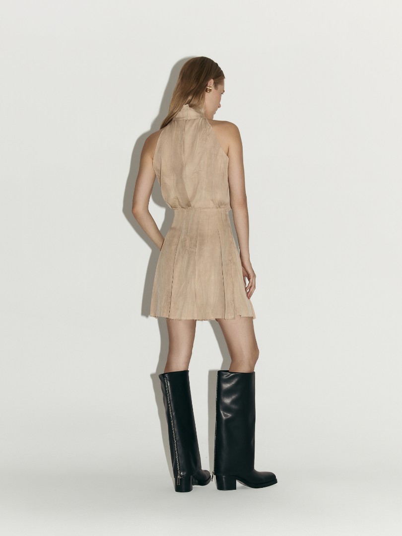 Топ-халтер из жатой ткани с эффектом washed out. Застежка на кнопки на воротнике-стойке сзади.