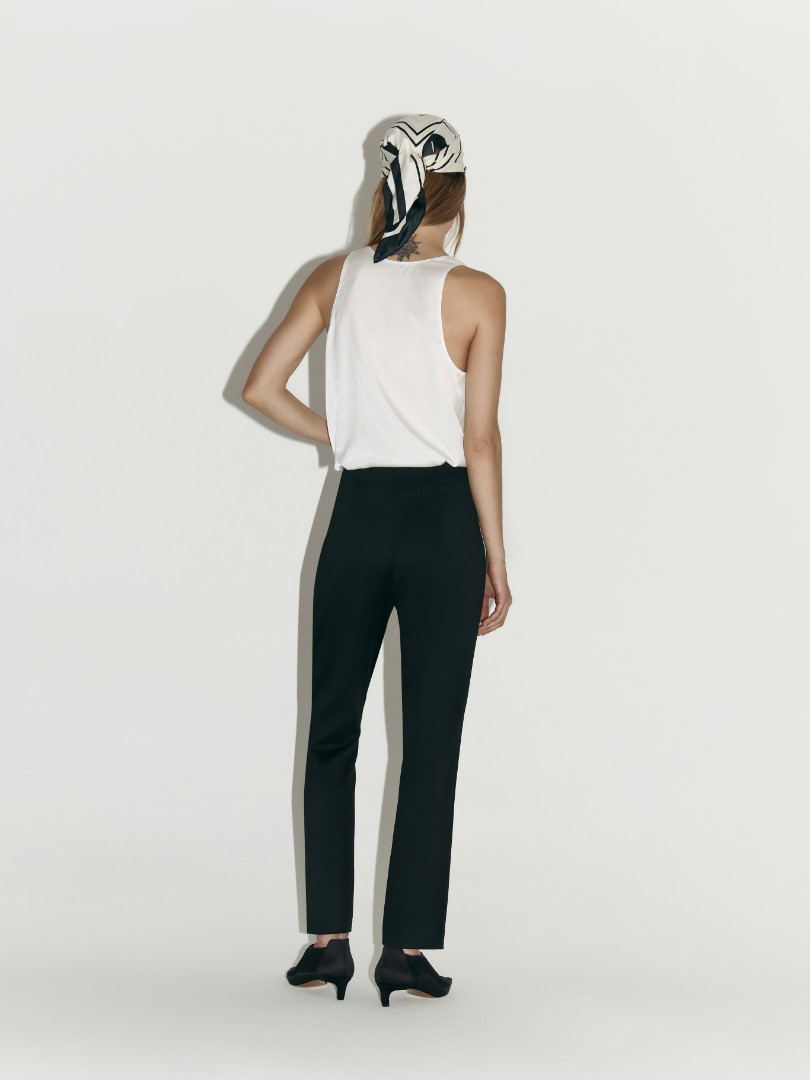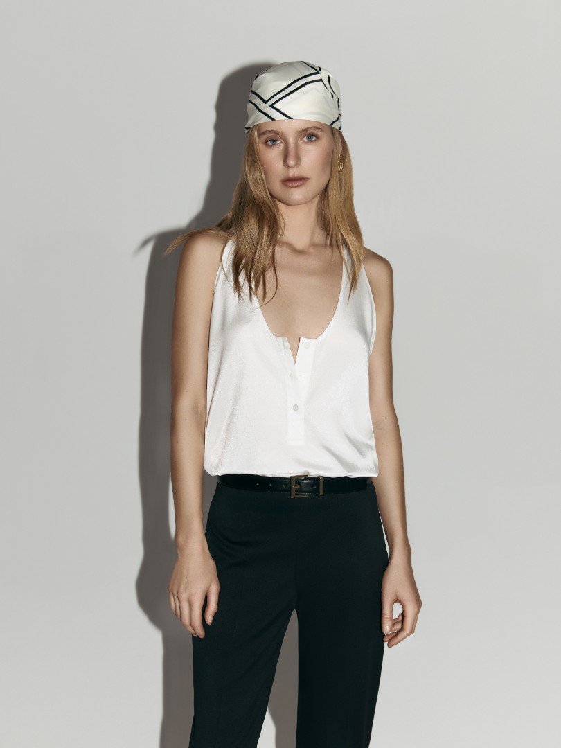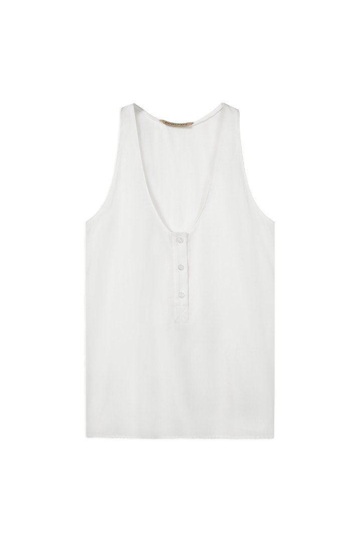 Топ с глубоким V-образным вырезом из тонкой вискозыМодель прямого кроя декорирована планкой с пуговицами спереди.