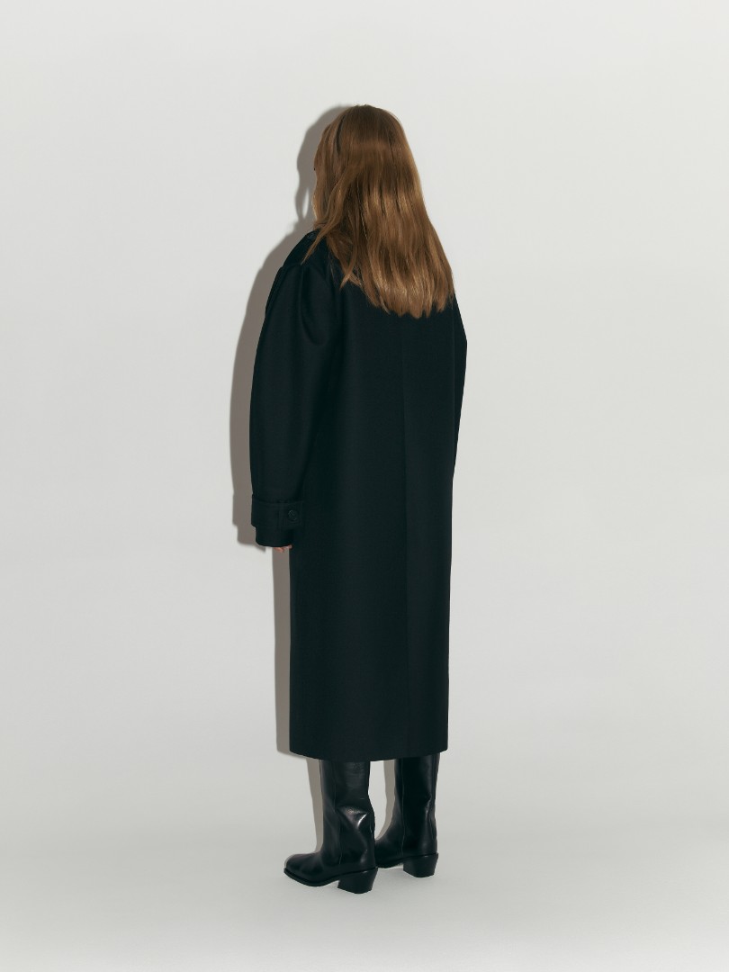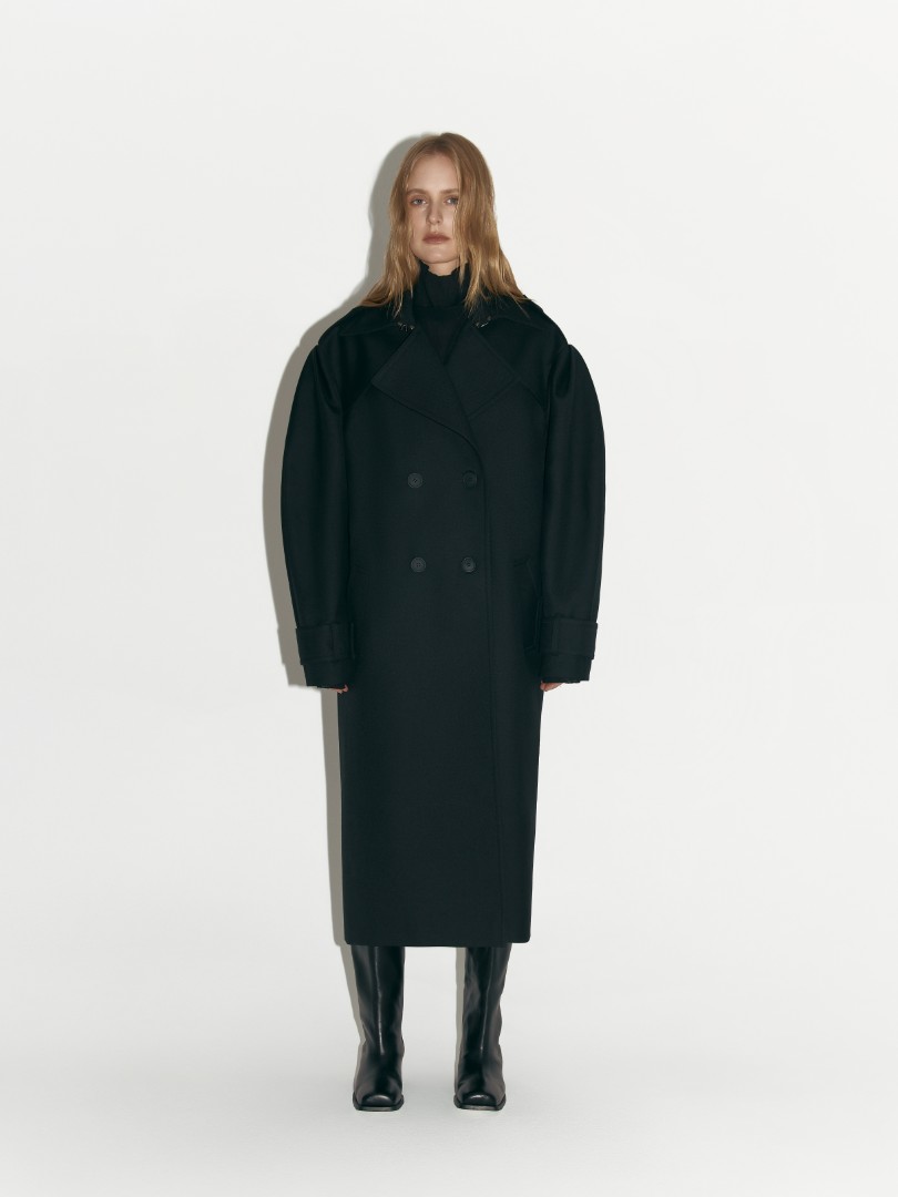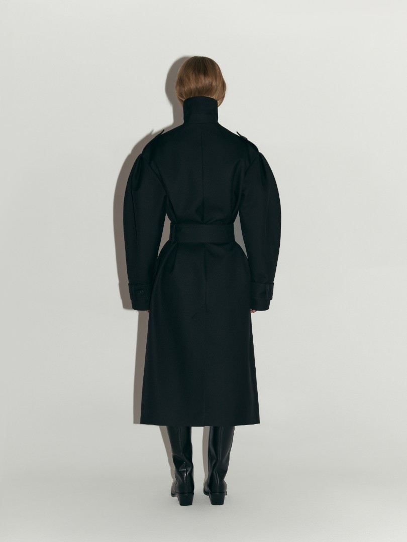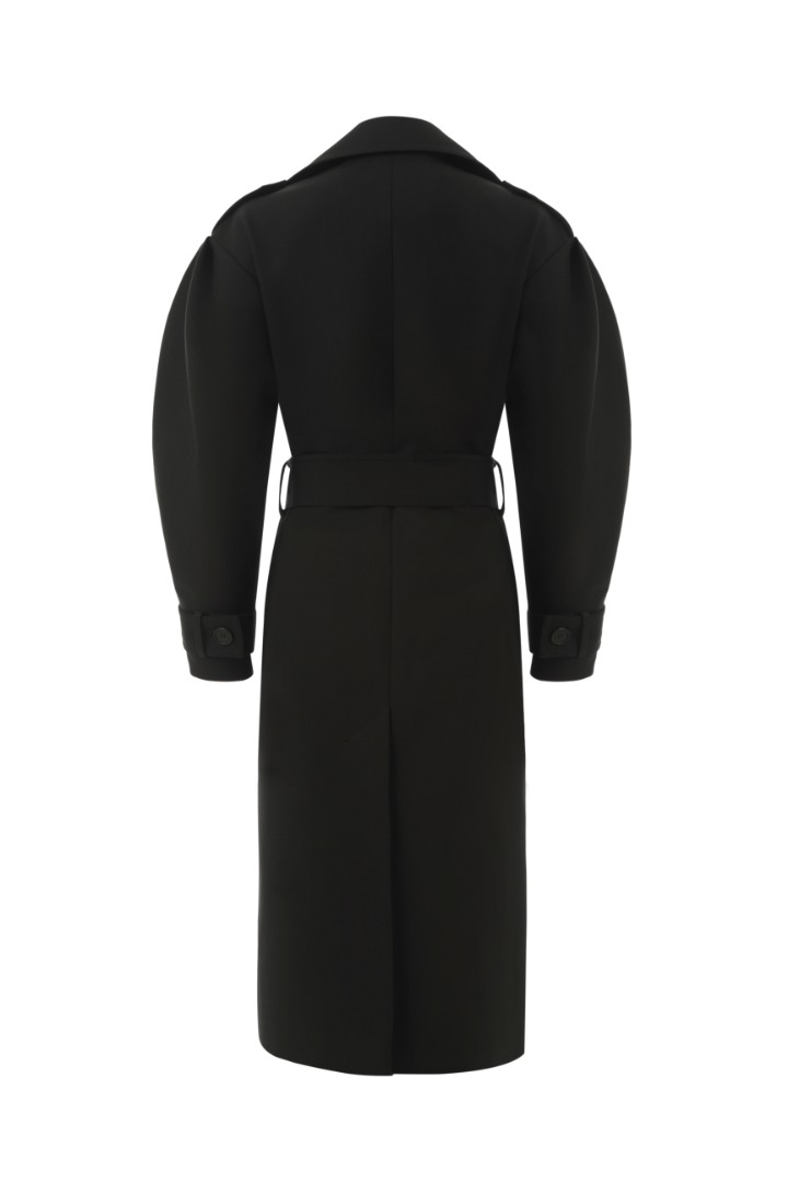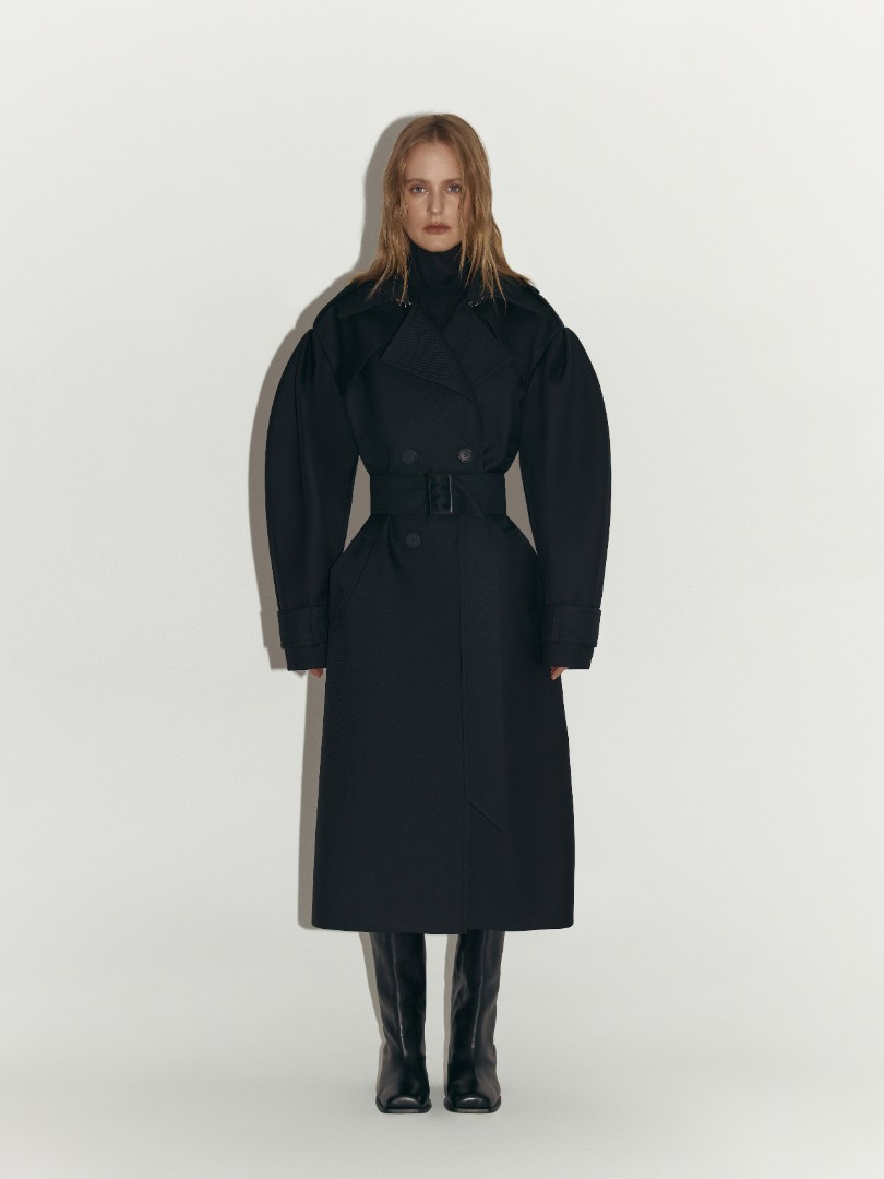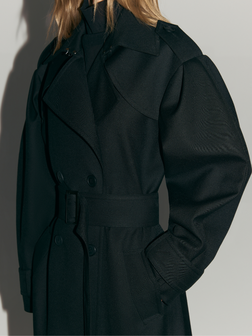 Двубортный тренч о-силуэта из плотной ткани с водоотталкивающей пропиткой. Ткань изделия хорошо держит форму и отличается своей долговечностью. В комплекте длинный пояс.