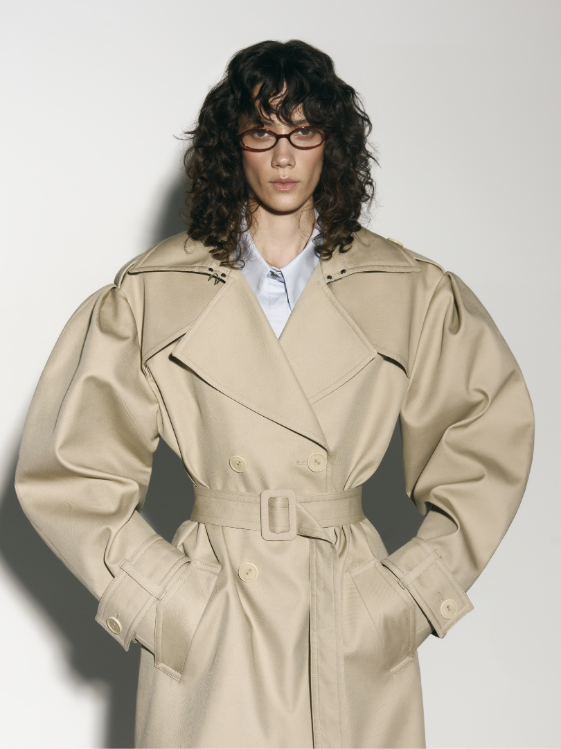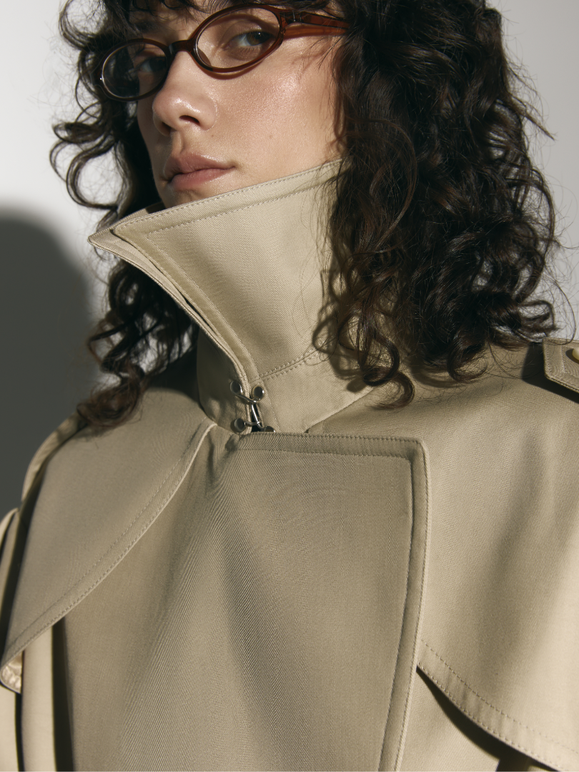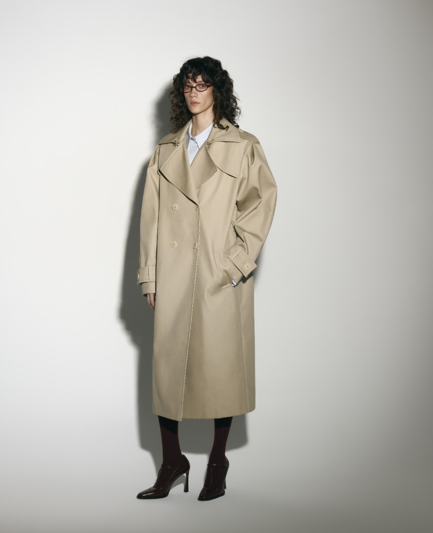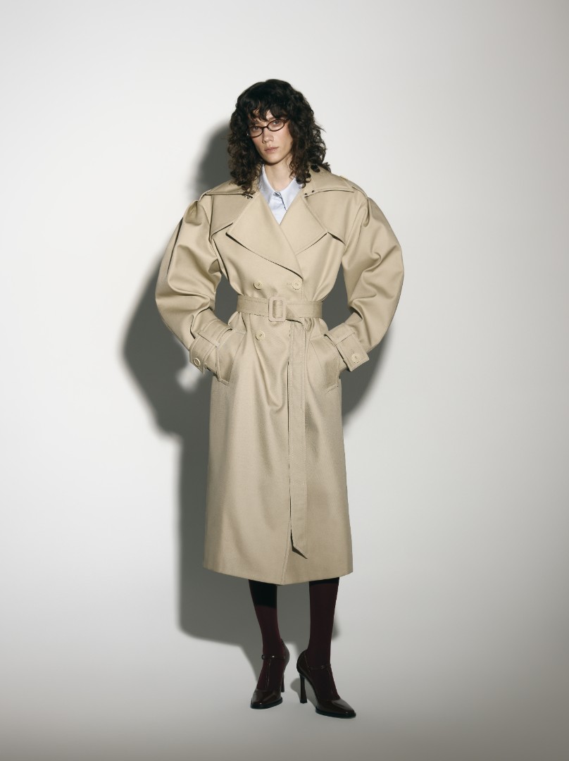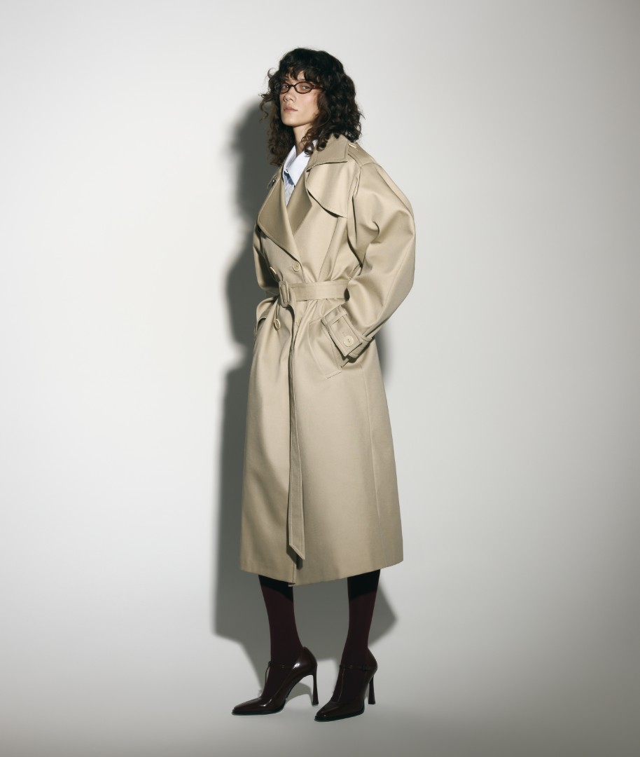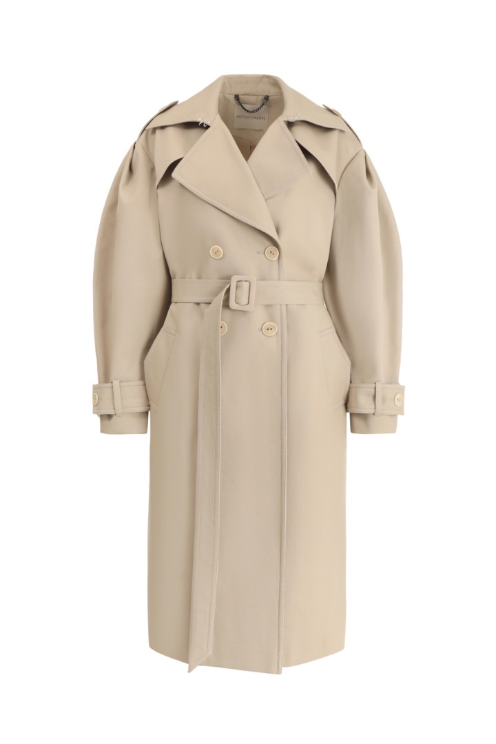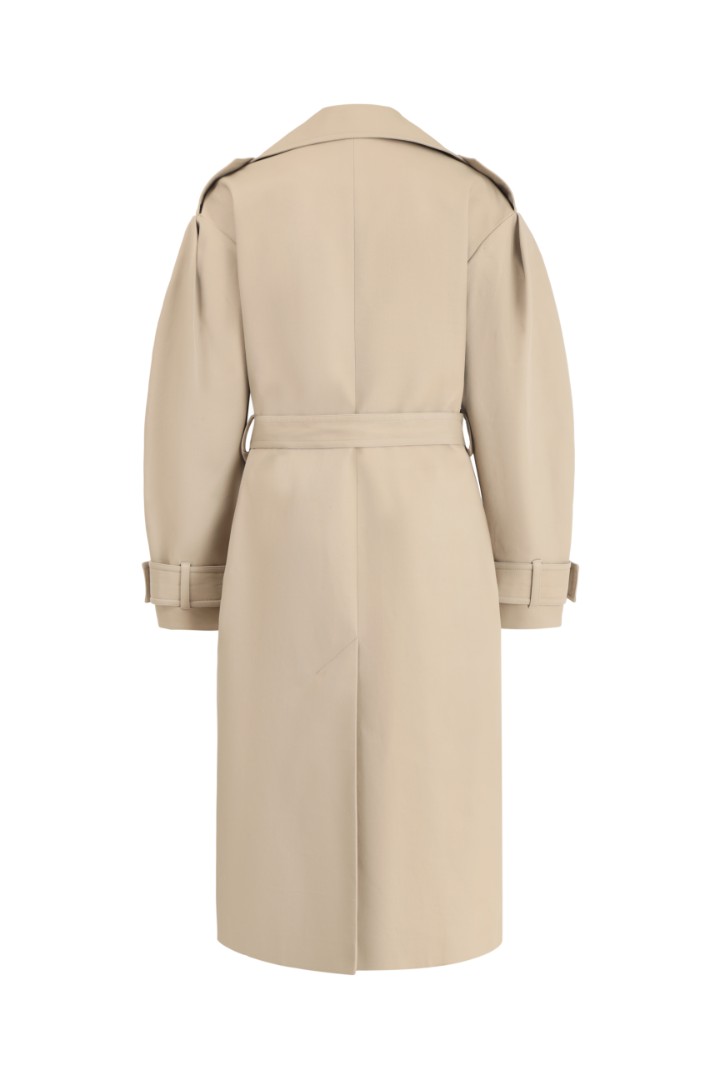 Двубортный тренч о-силуэта из плотной ткани с водоотталкивающей пропиткой. Ткань изделия хорошо держит форму и отличается своей долговечностью. В комплекте длинный пояс.
