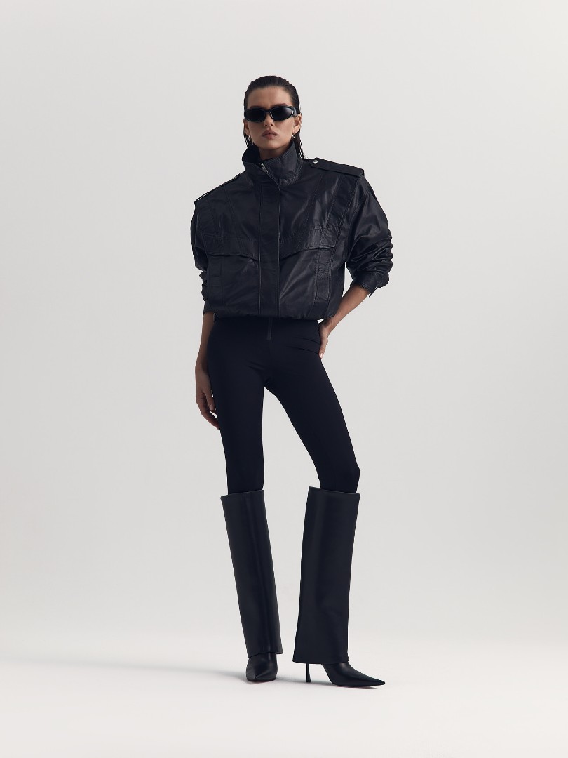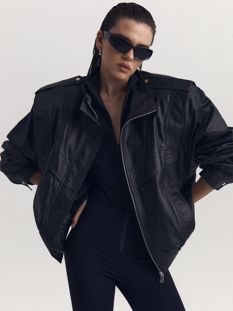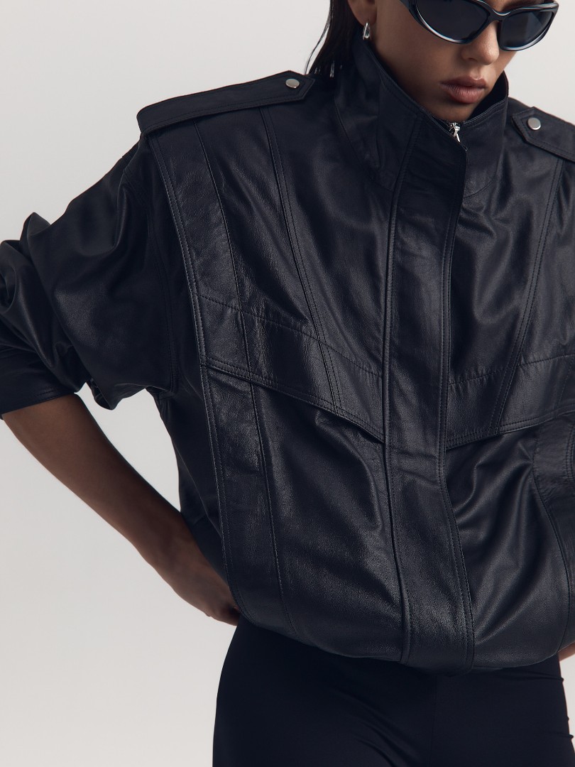 Куртка из натуральной кожи с воротником-стойкой. Эполеты и манжеты на металлических кнопках. Функциональные боковые карманы. Застежка на молнию.
