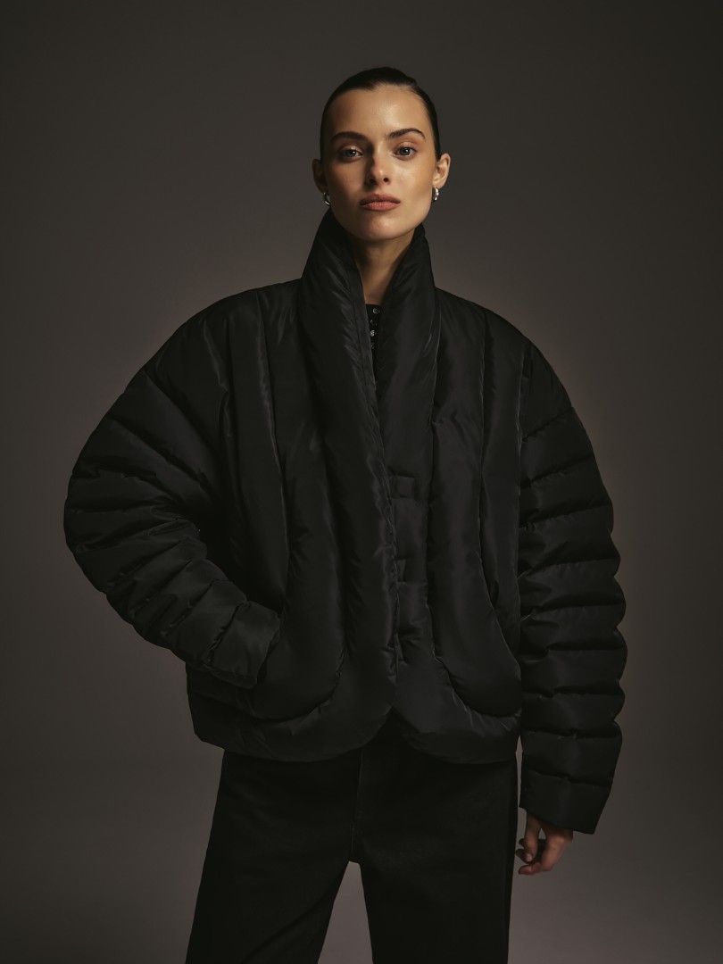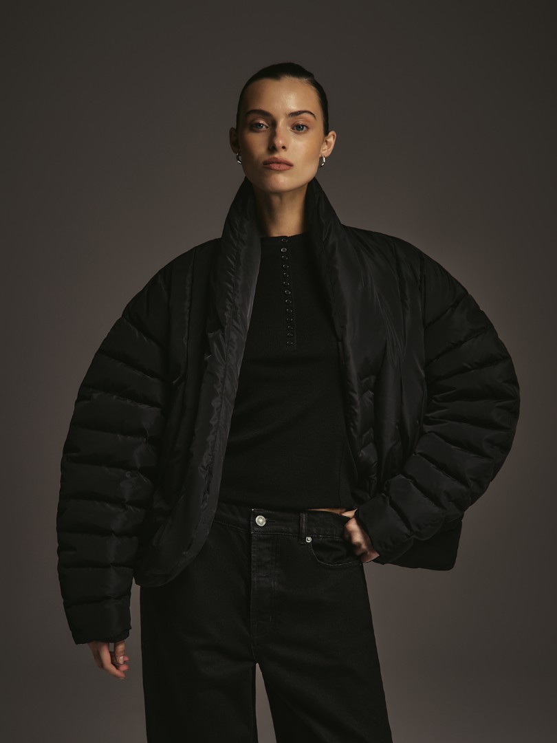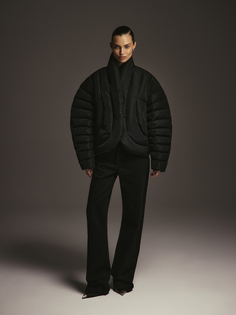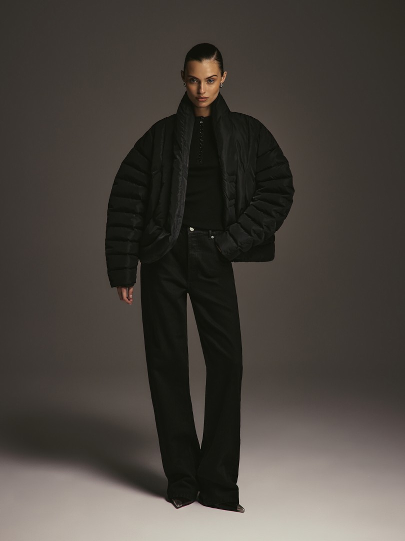 Объемный пуховик с рукавами о-силуэта. Модель с фигурной линией борта, воротником-стойкой и магнитной застежкой.