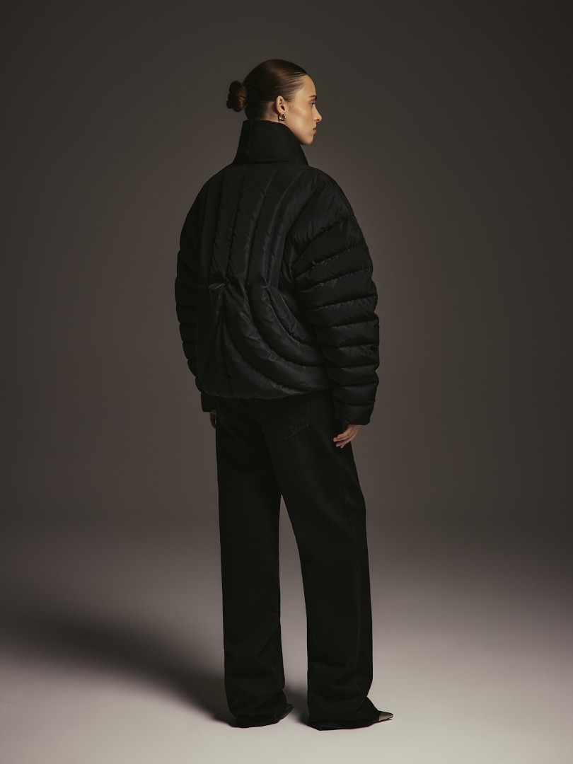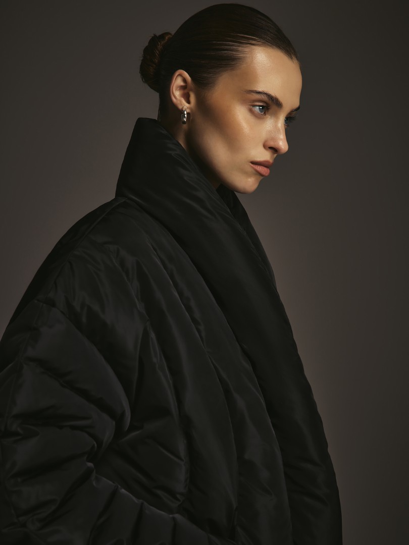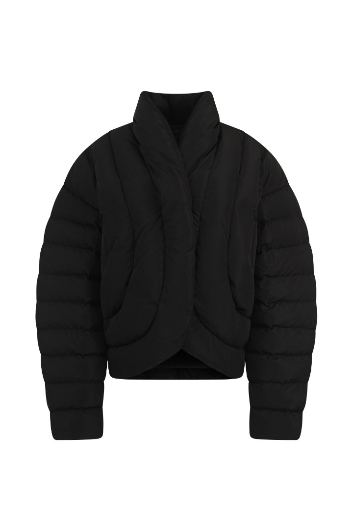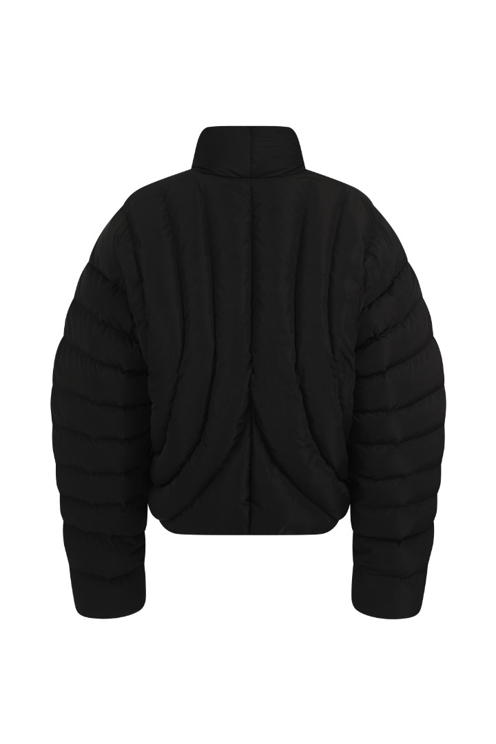 Объемный пуховик с рукавами о-силуэта. Модель с фигурной линией борта, воротником-стойкой и магнитной застежкой.