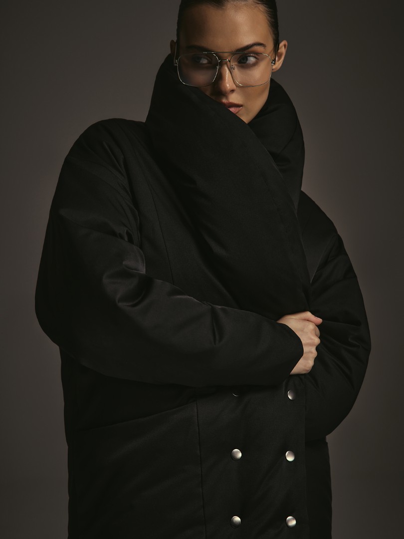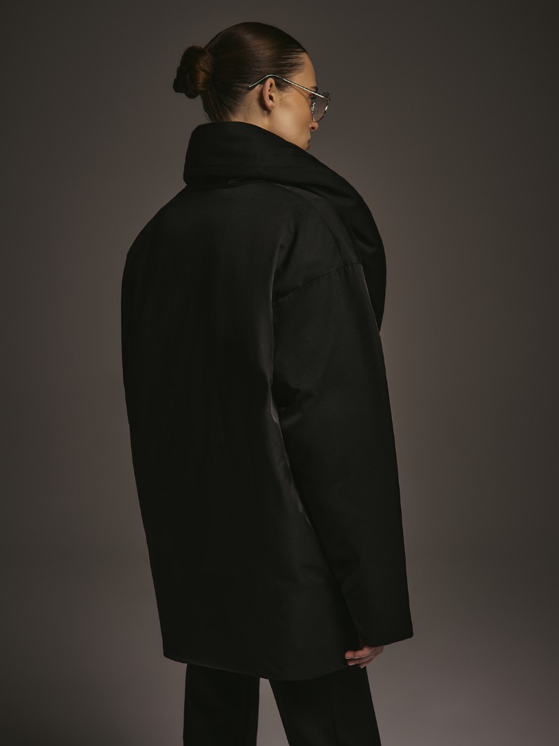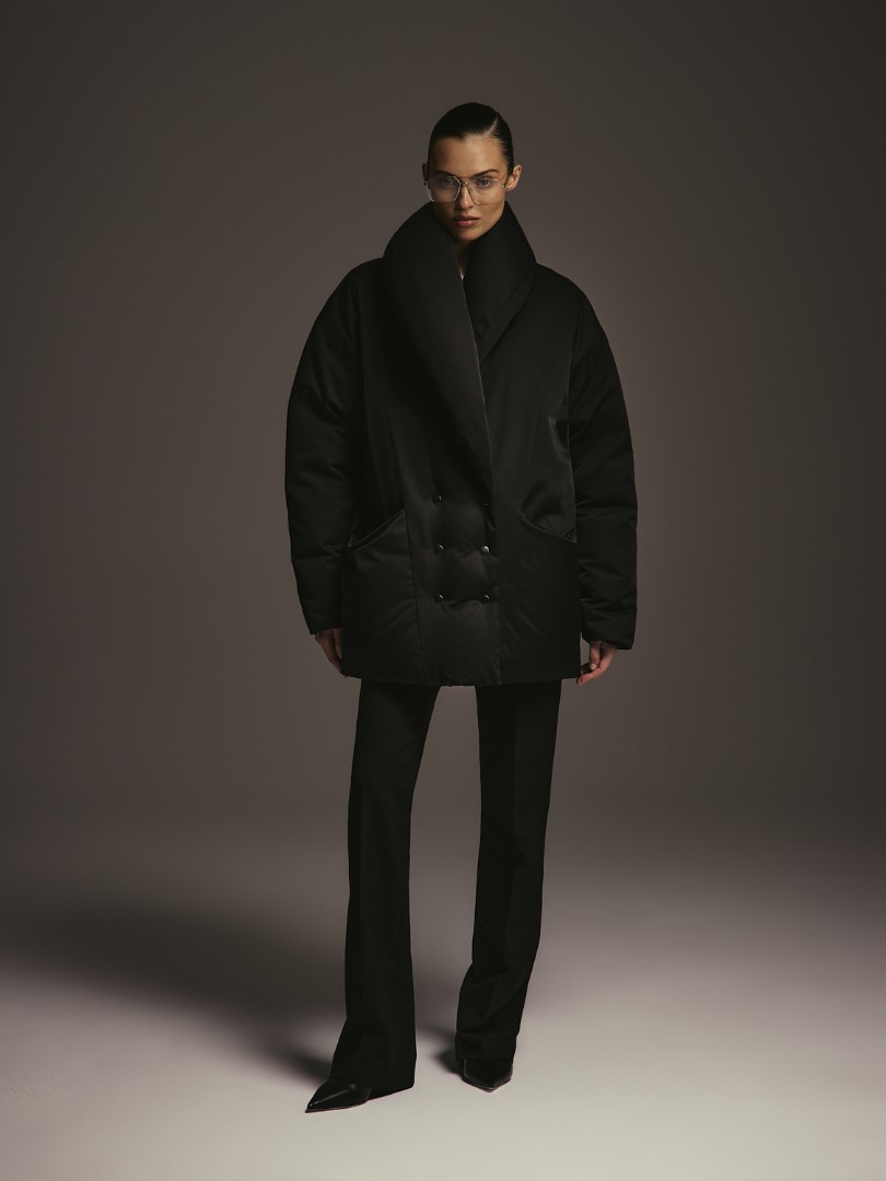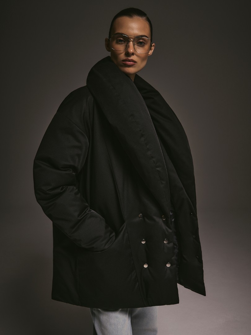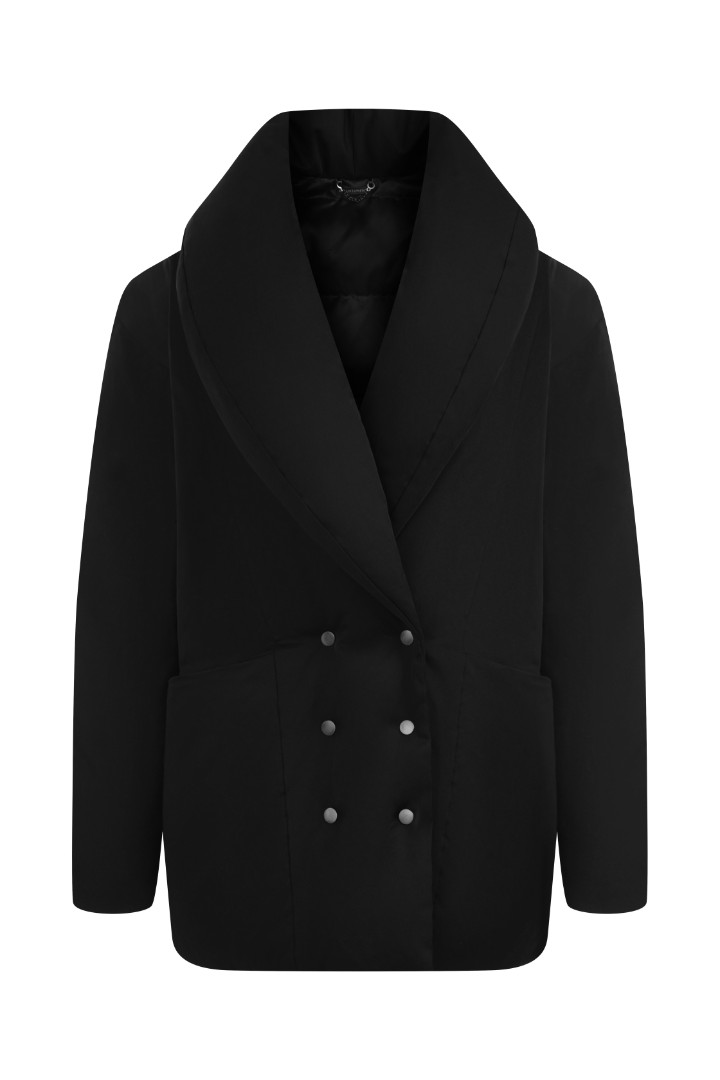 Пуховик-жакет оверсайз кроя с объемной линией борта. Модель с вместительными накладными карманами и двубортной застежкой на кнопки.
