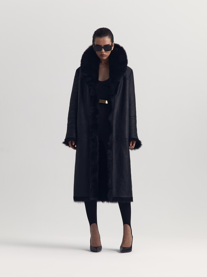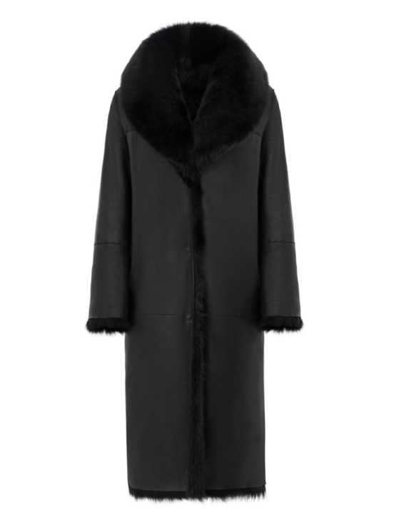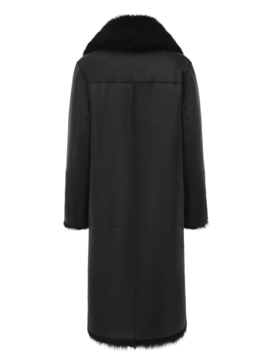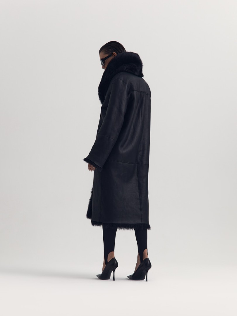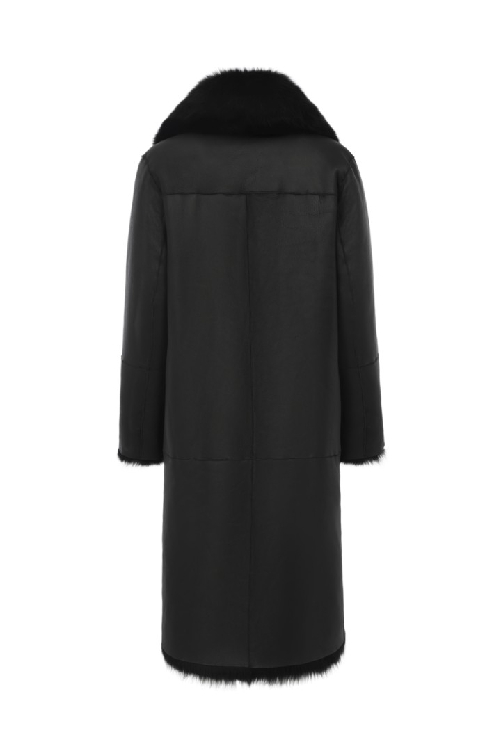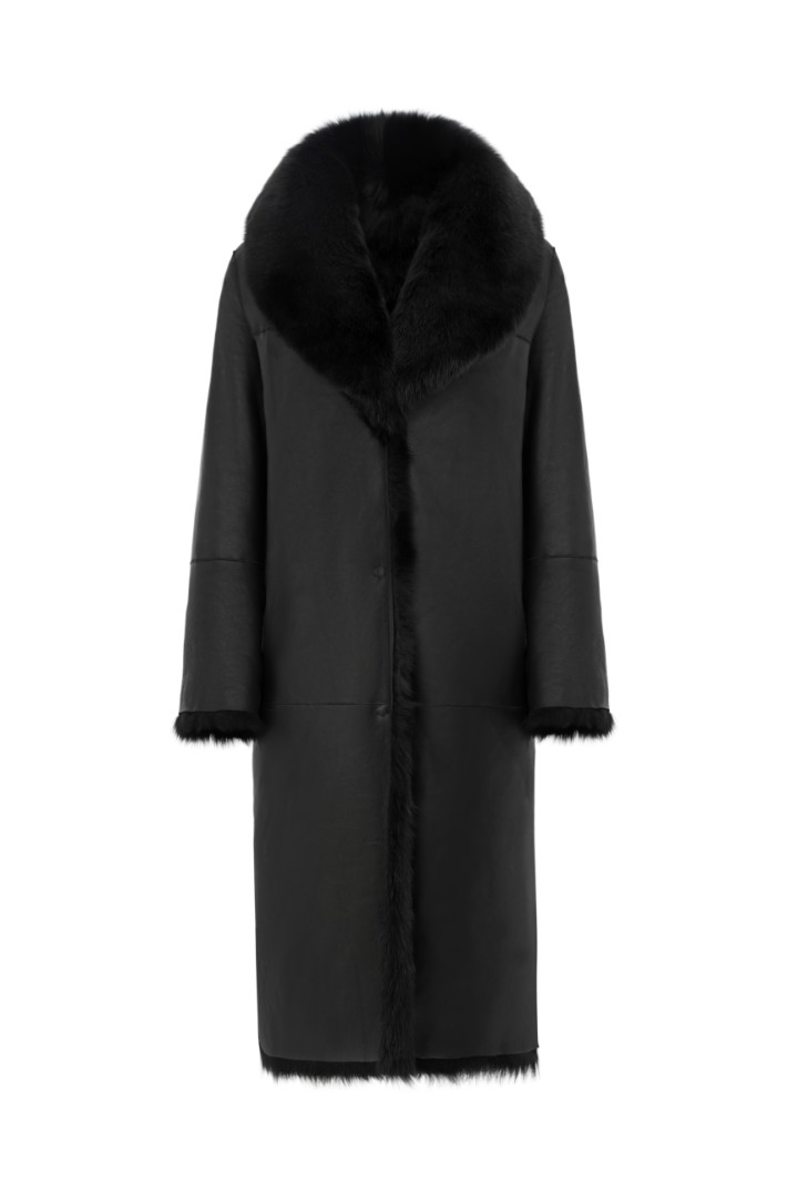 Двусторонняя шуба-дубленка из натуральной овчины. Модель длины миди дополнена широким шалевым воротником и застежкой-крючком.