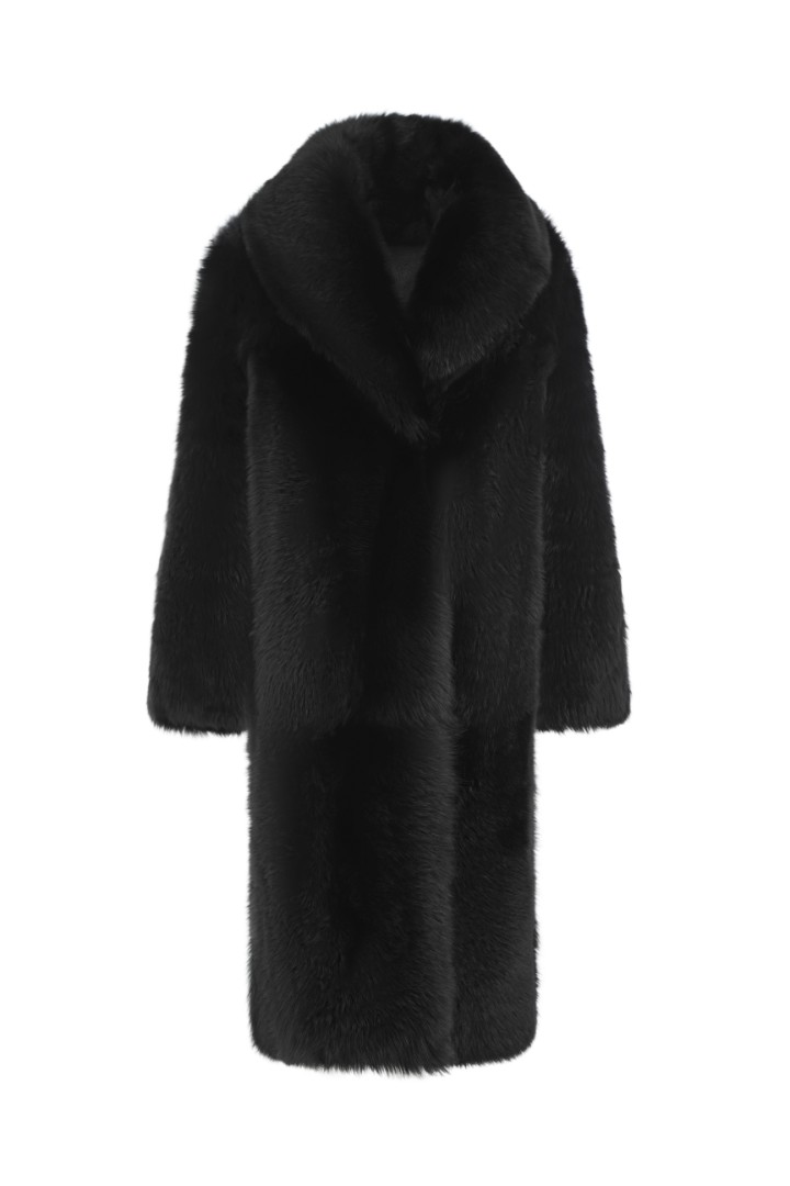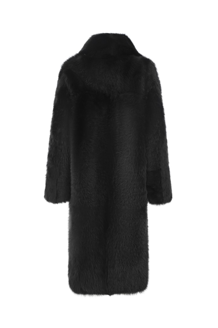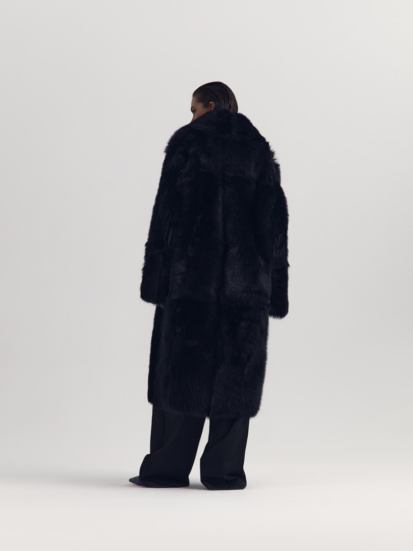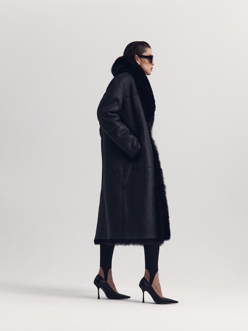 Двусторонняя шуба-дубленка из натуральной овчины. Модель длины миди дополнена широким шалевым воротником и застежкой-крючком.
