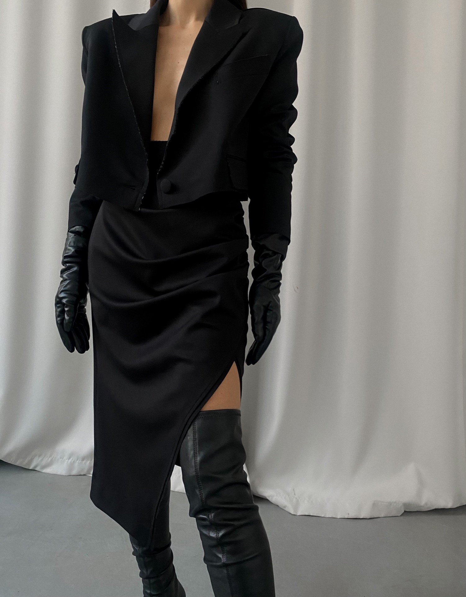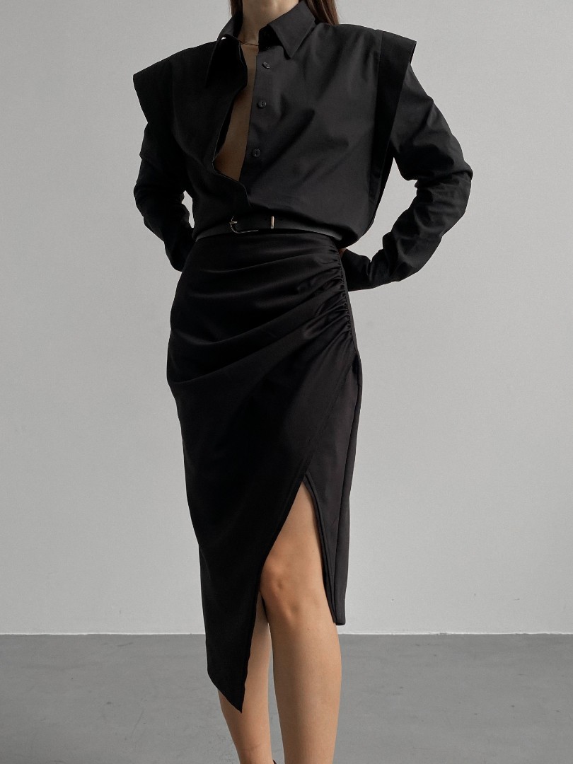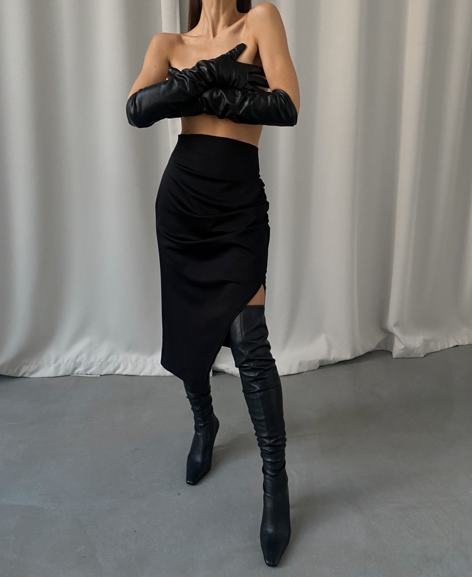Юбка на запах с драпировкой длины миди. Сложный крой юбки и высокая посадка подчеркивают фигуру и создают максимально женственный образ. Лаконичный силуэт модели предполагает множество вариантов стилизации и позволяет интегрировать юбку в вечерние, деловые или повседневные аутфиты.