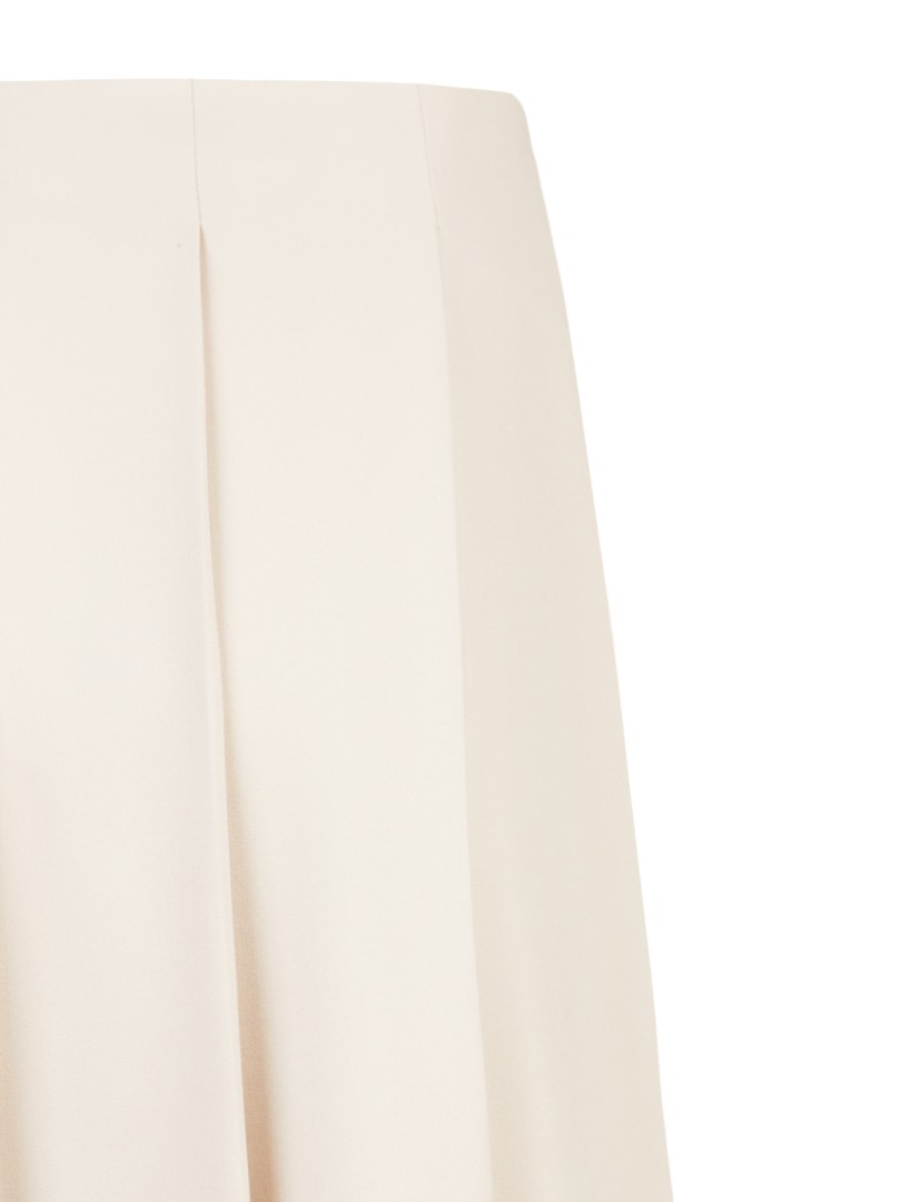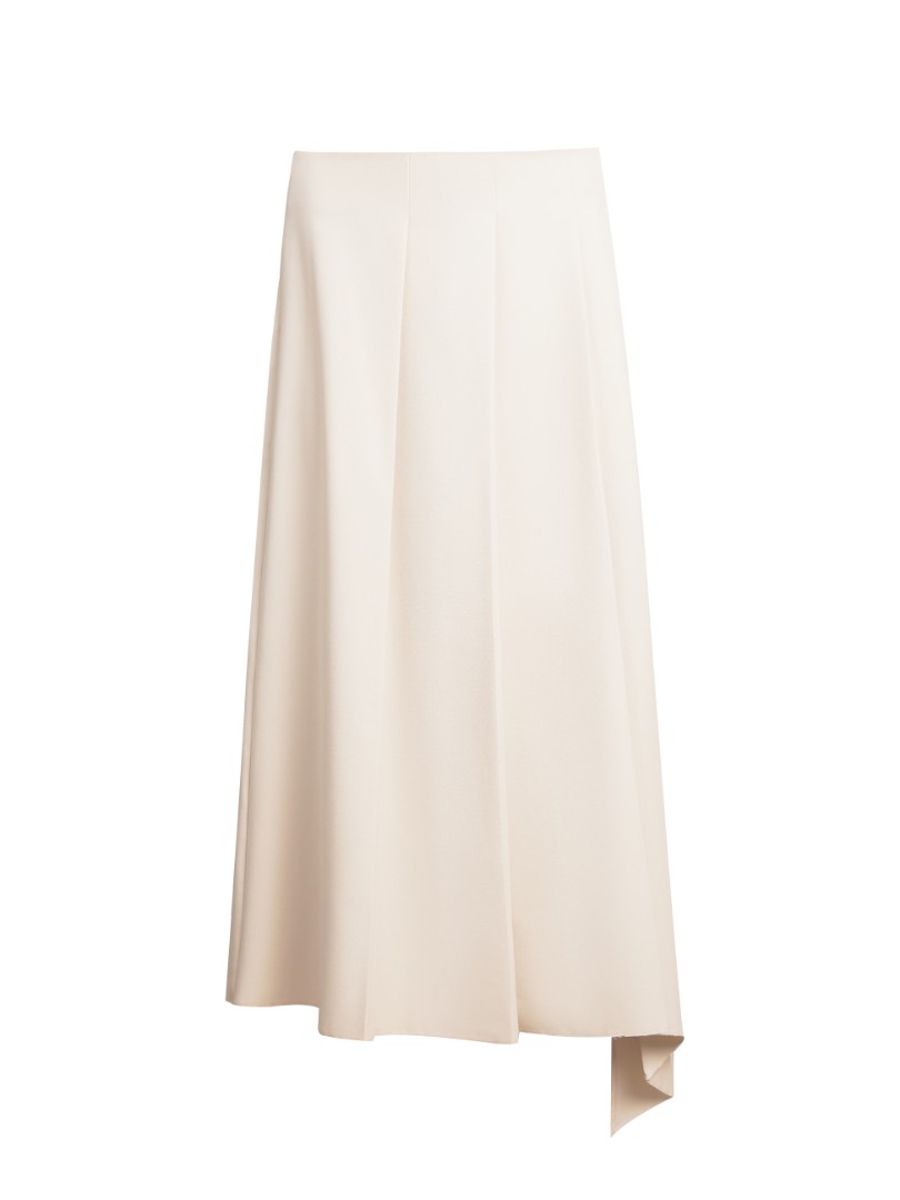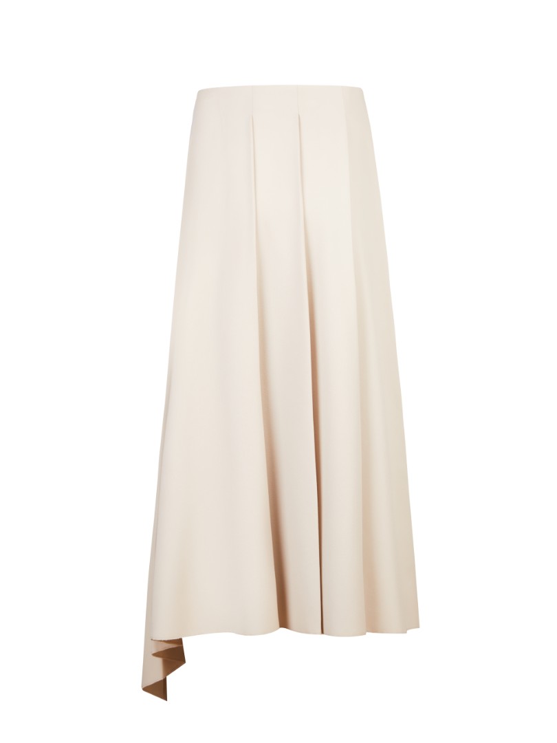 Юбка асимметричного кроя со складками. Модель с необработанным нижним краем дополнена высоким разрезом с левой стороны, открывающим ногу при ходьбе. Ткань с добавлением вискозы хорошо держит форму, сохраняя плиссированные складки четкими.