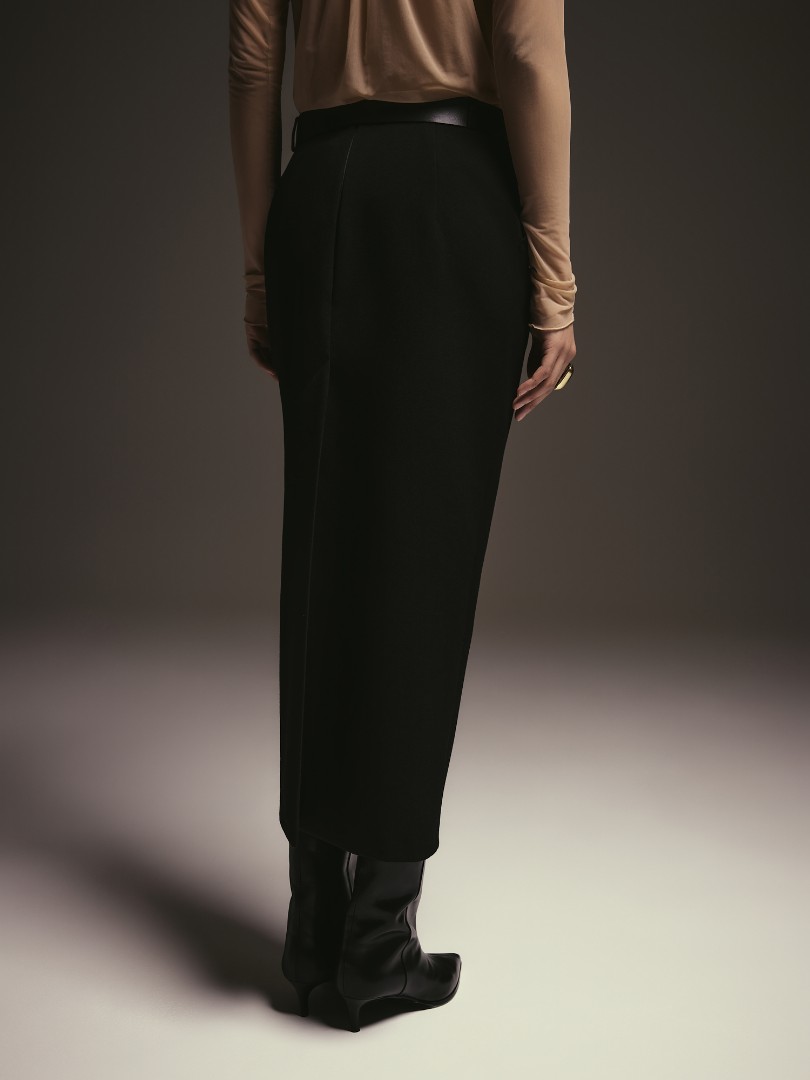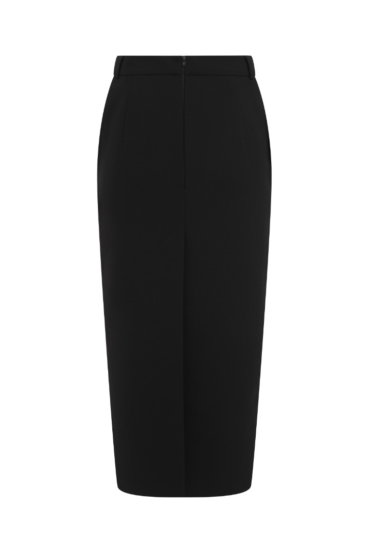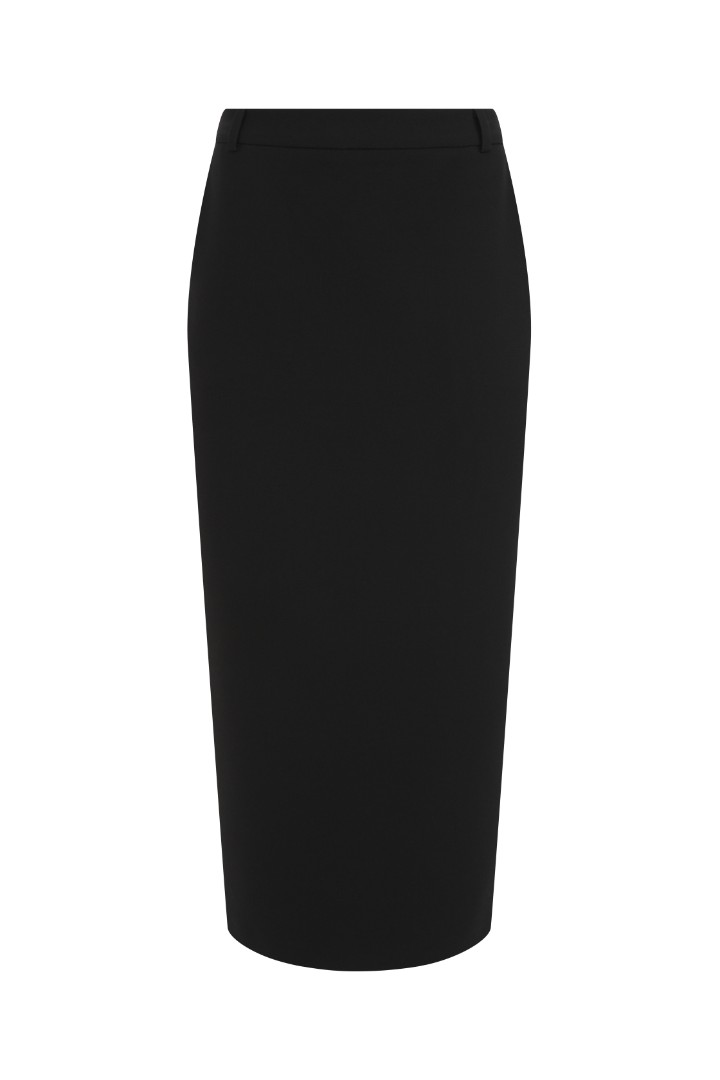 Прямая юбка миди из костюмной ткани. Модель со средней посадкой, карманами в боковых швах и шлевками для ремня. Застёжка на потайную молнию.