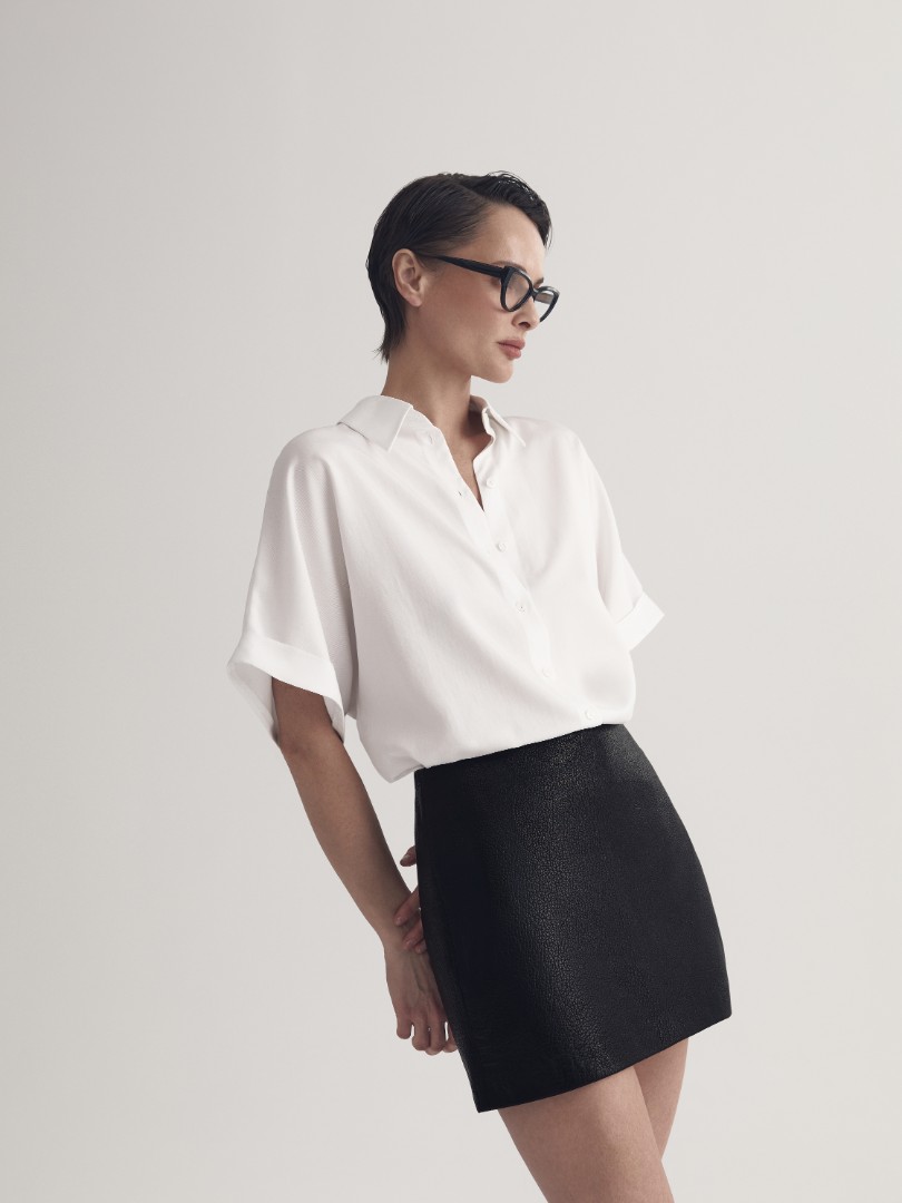Мини-юбка прямого кроя из натуральной фактурной кожи. Средняя посадка, врезные боковые карманы и застежка на потайную молнию.