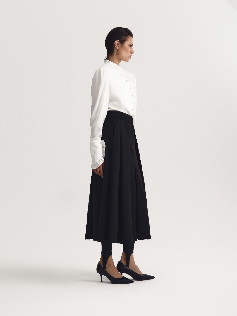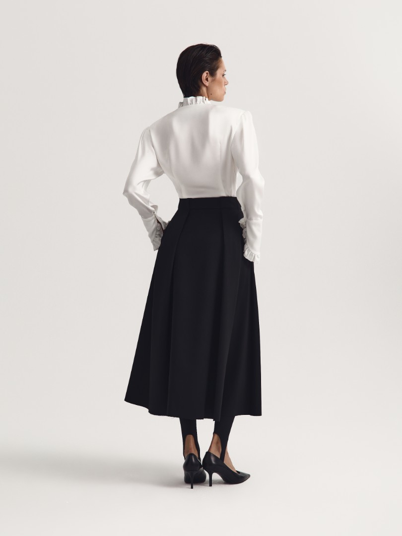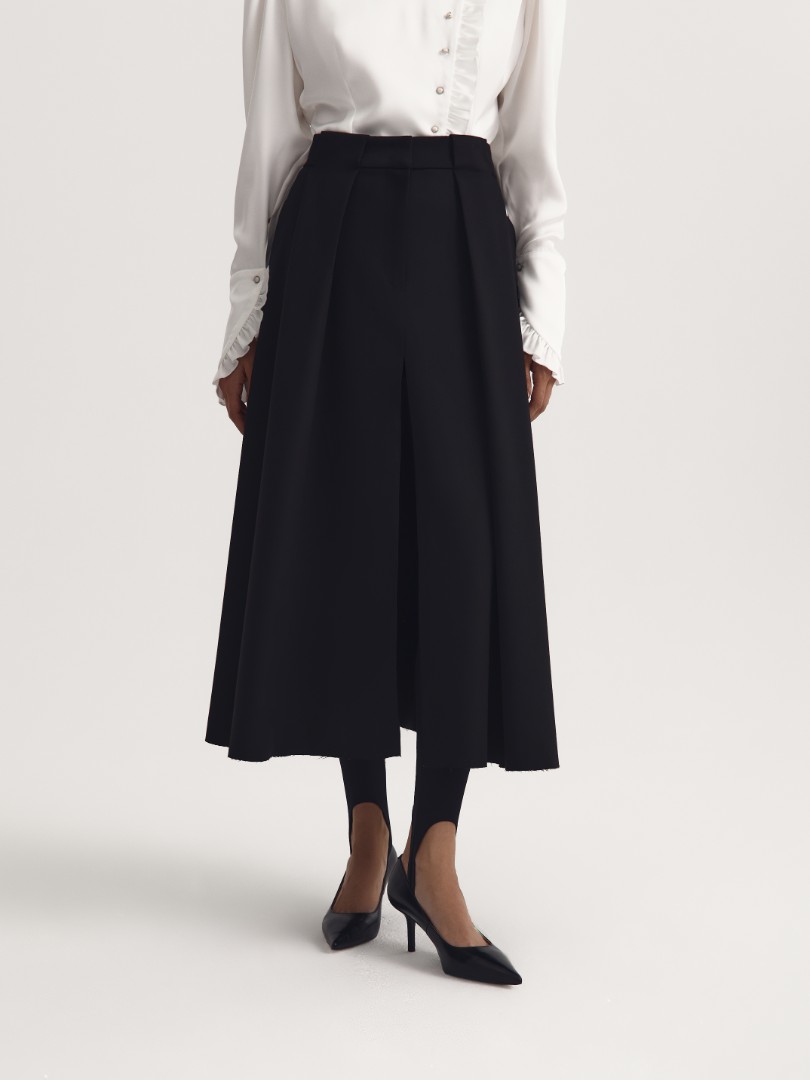 Юбка миди из костюмной ткани. Защипы на талии образуют крупные складки по всей длине. Модель декорирована высоким разрезом спереди и необработанным нижним краем. Застежка на молнию спереди.