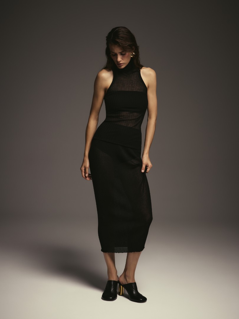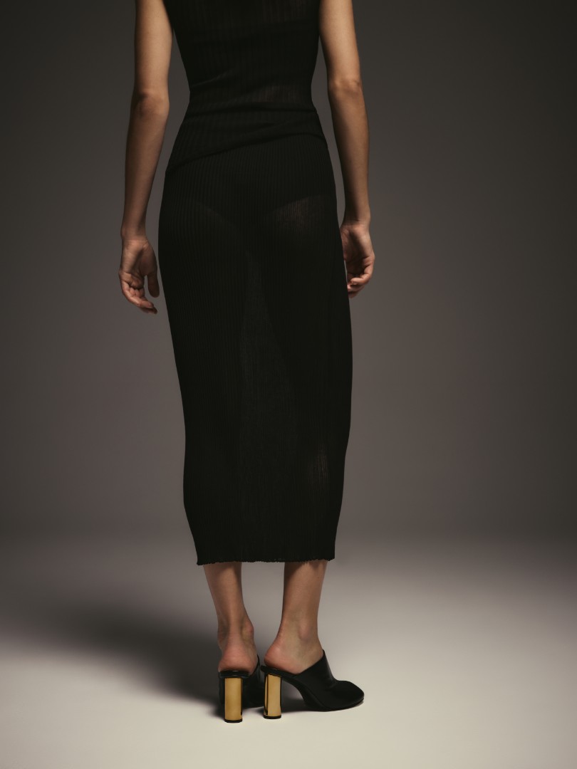 Полупрозрачная юбка из трикотажа в рубчик. Модель прямого силуэта с эластичной резинкой на поясе.