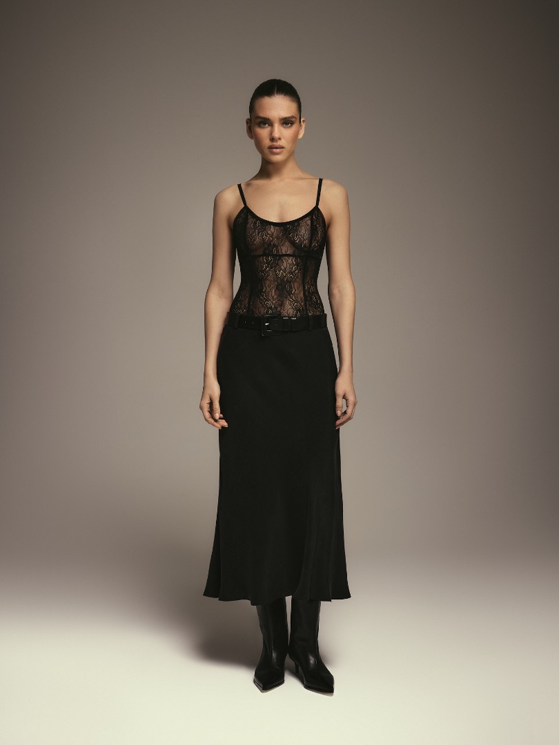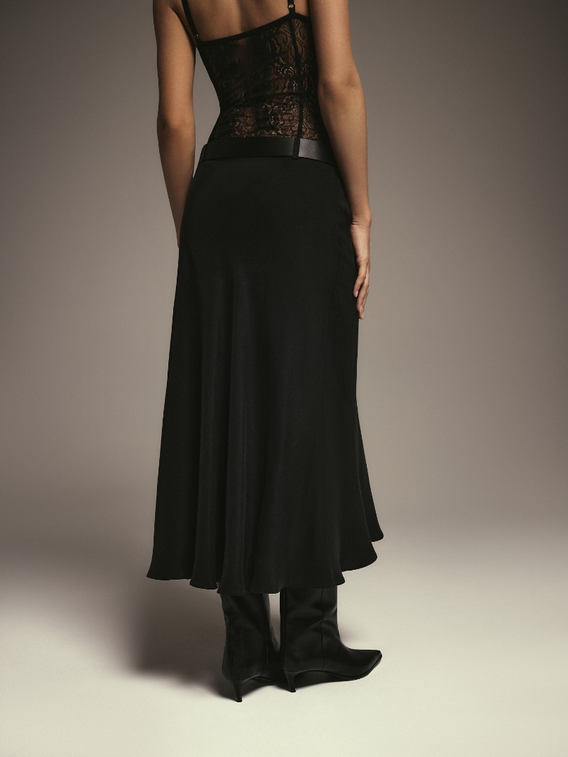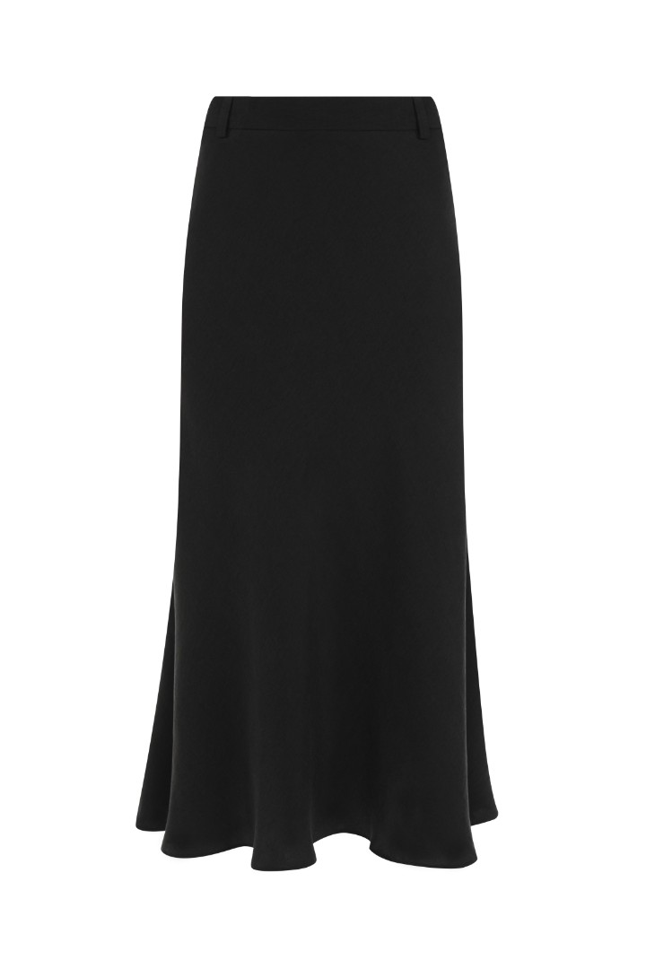 Юбка миди А-силута из струящейся ткани с лёгким сатиновым блеском. Модель со средней посадкой, шлевками для ремня и застёжкой на потайную молнию.