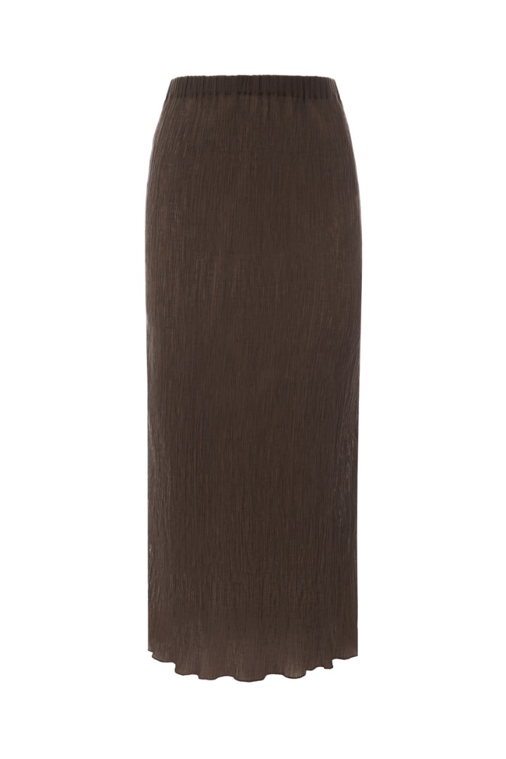 Юбка миди из фактурной жатой ткани прямого силуэта с эластичной резинкой на поясе. Изделие составит завершенный вечерний образ с топом SOULSATION и более базовое сочетание с лонгсливом DUNE из той же ткани.