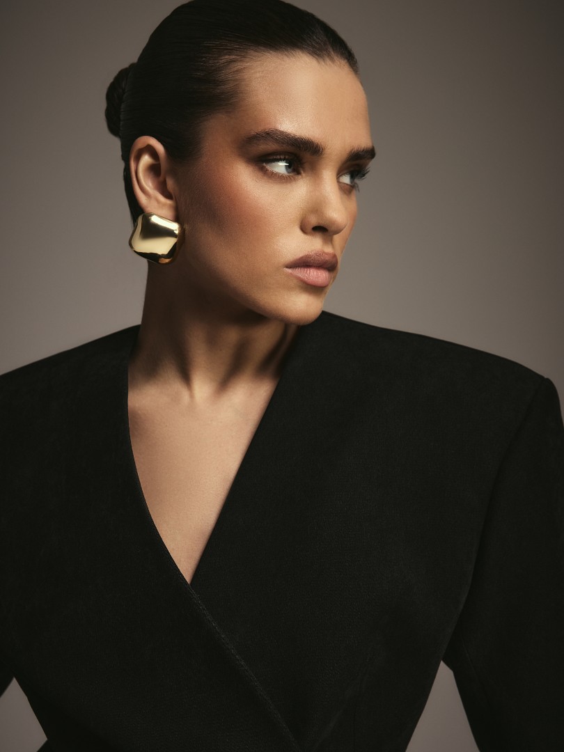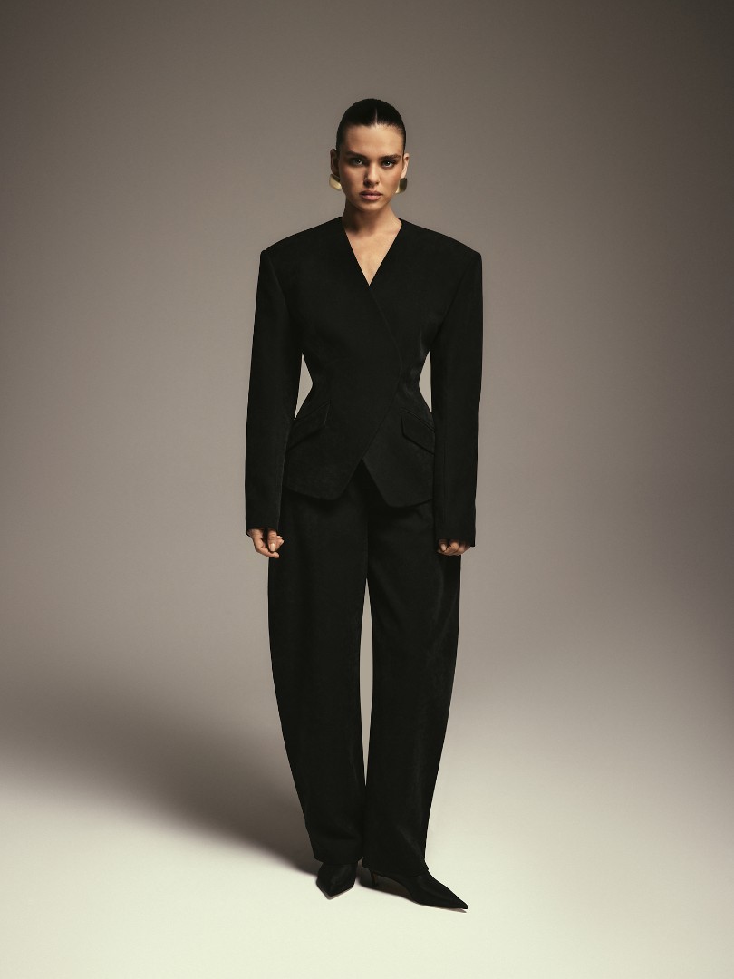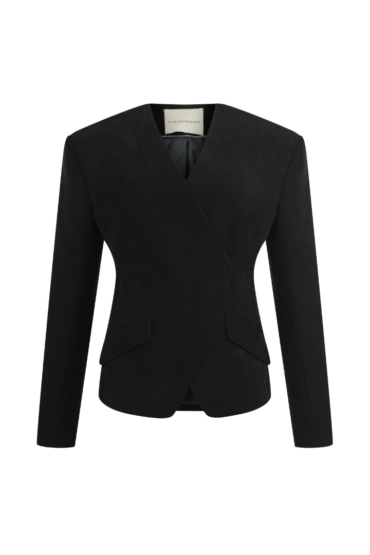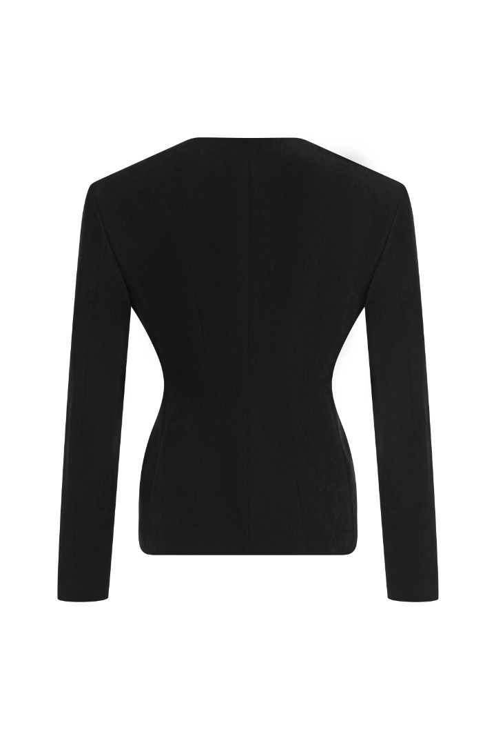 Приталенный жакет из микровельвета на подкладке. Подплечники, v-образный вырез без лацканов и фигурная линия борта. Застежка на кнопки.