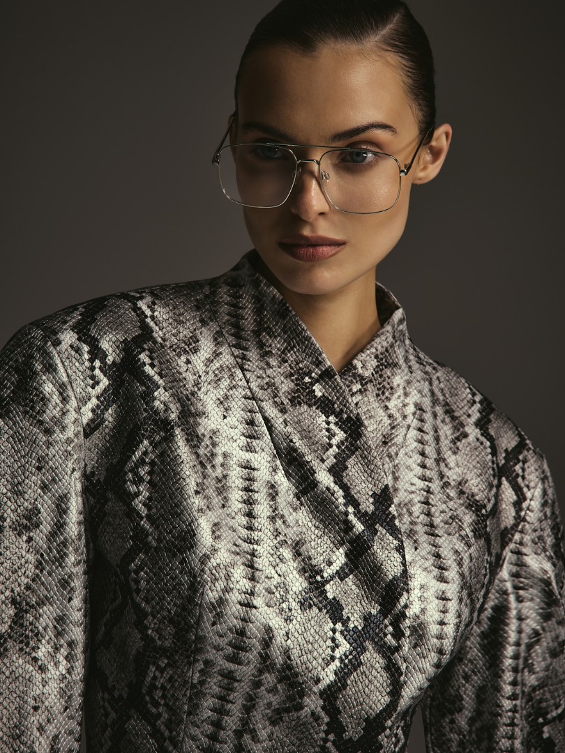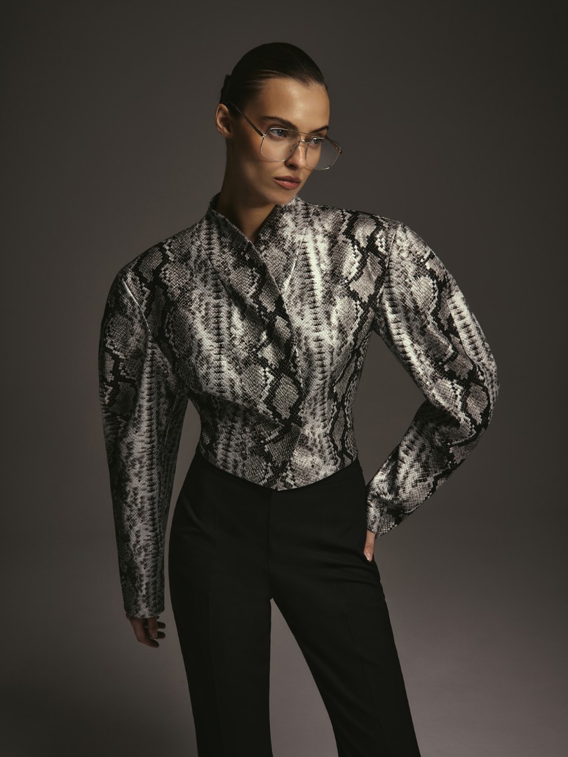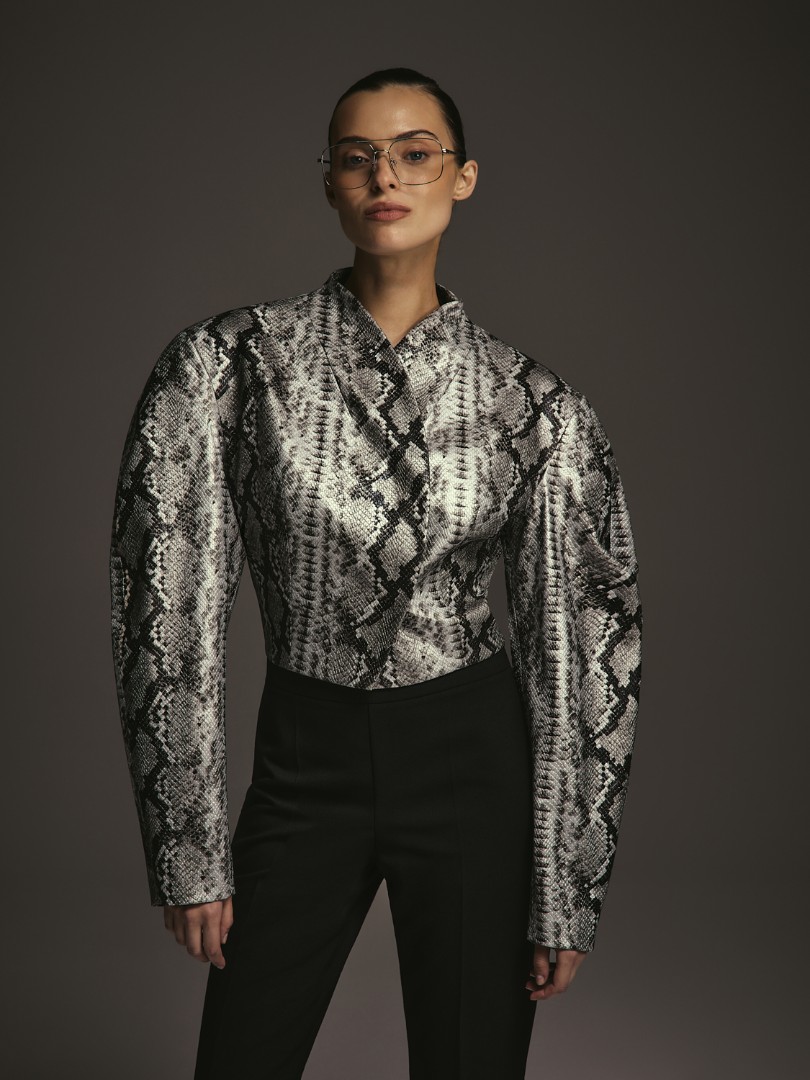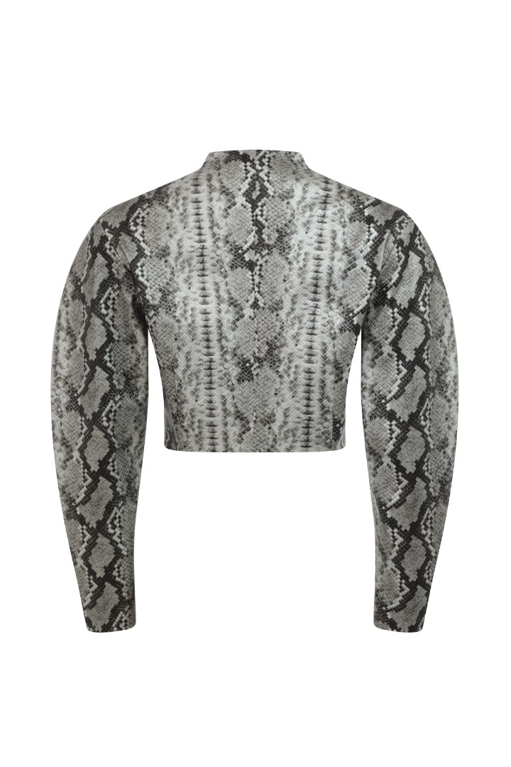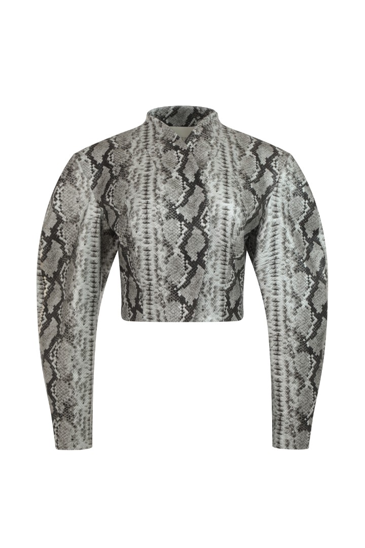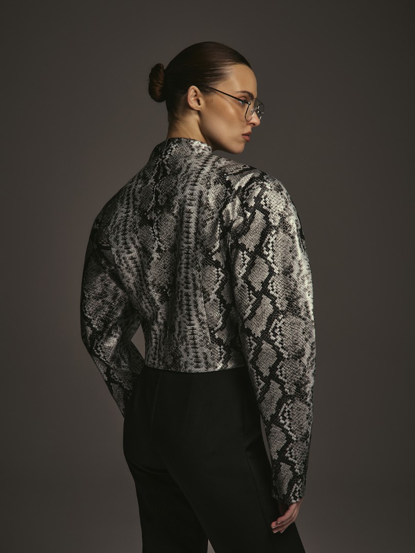 Укороченный приталенный жакет из фактурной эко-кожи на подкладке. Объемные фигурные рукава с подплечниками. Застежка на потайные кнопки.
